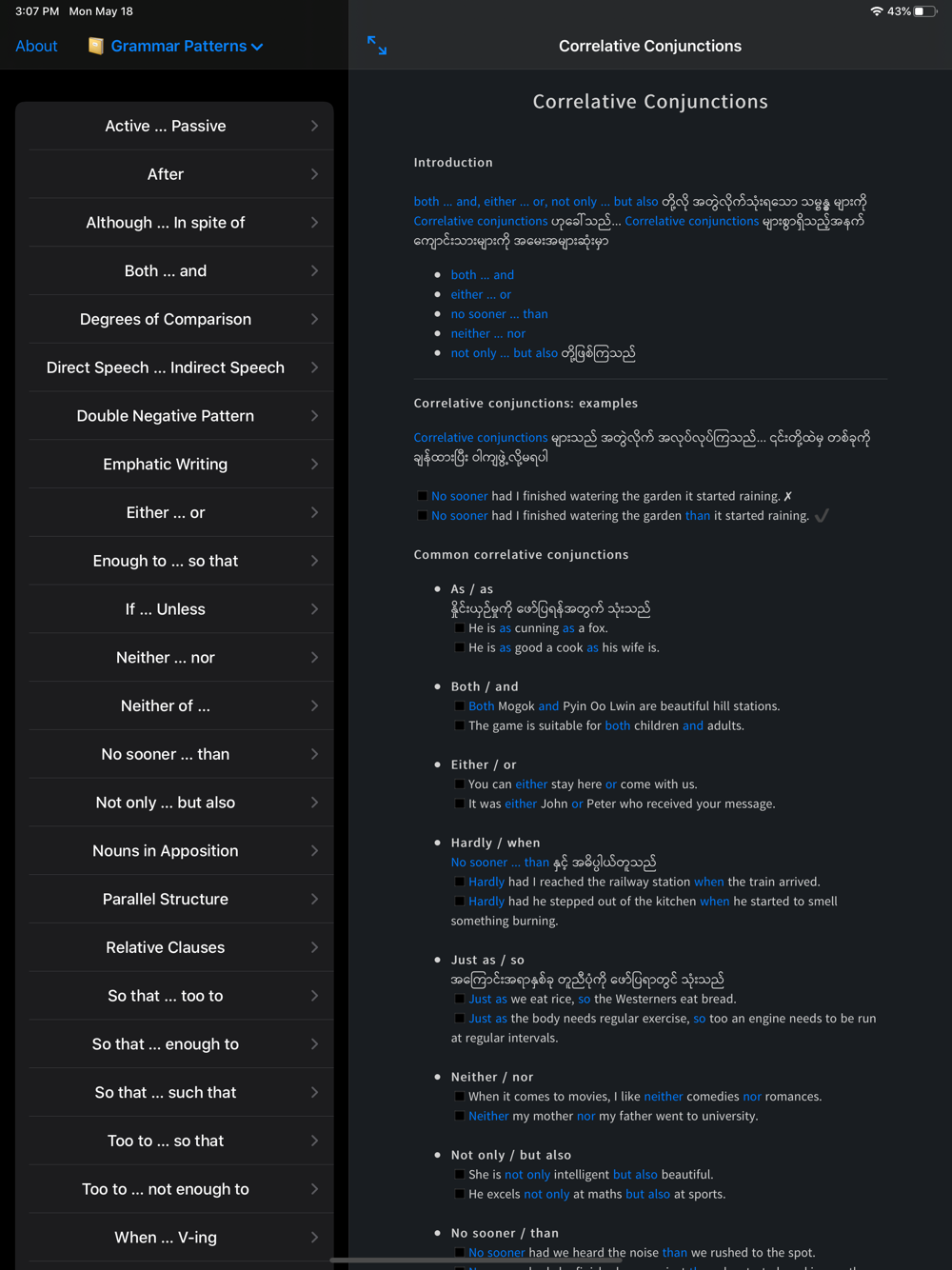 This app helps ease the pain by showing rules to remember and more importantly, it shows example sentences.