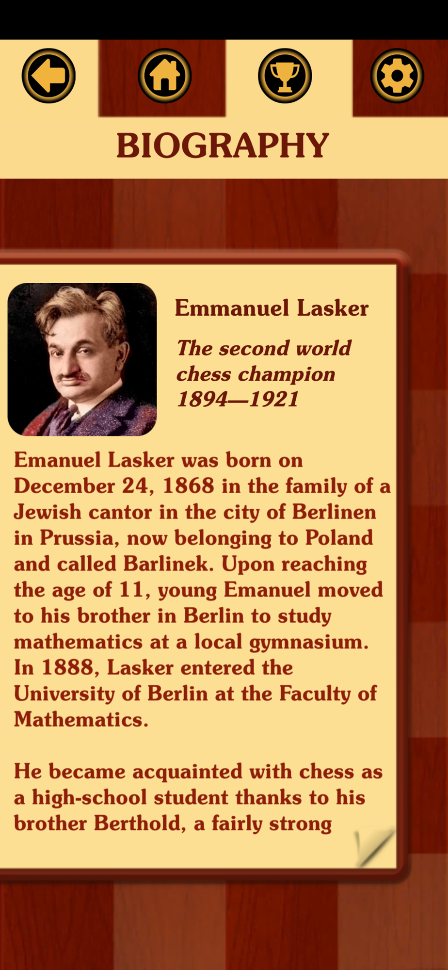 You have to study 50 commented games of the second World Chess Champion - Emanuel Lasker. In each game there will be tasks where it is necessary to find a move or the whole variation of the great Maestro, "to play like Lasker".