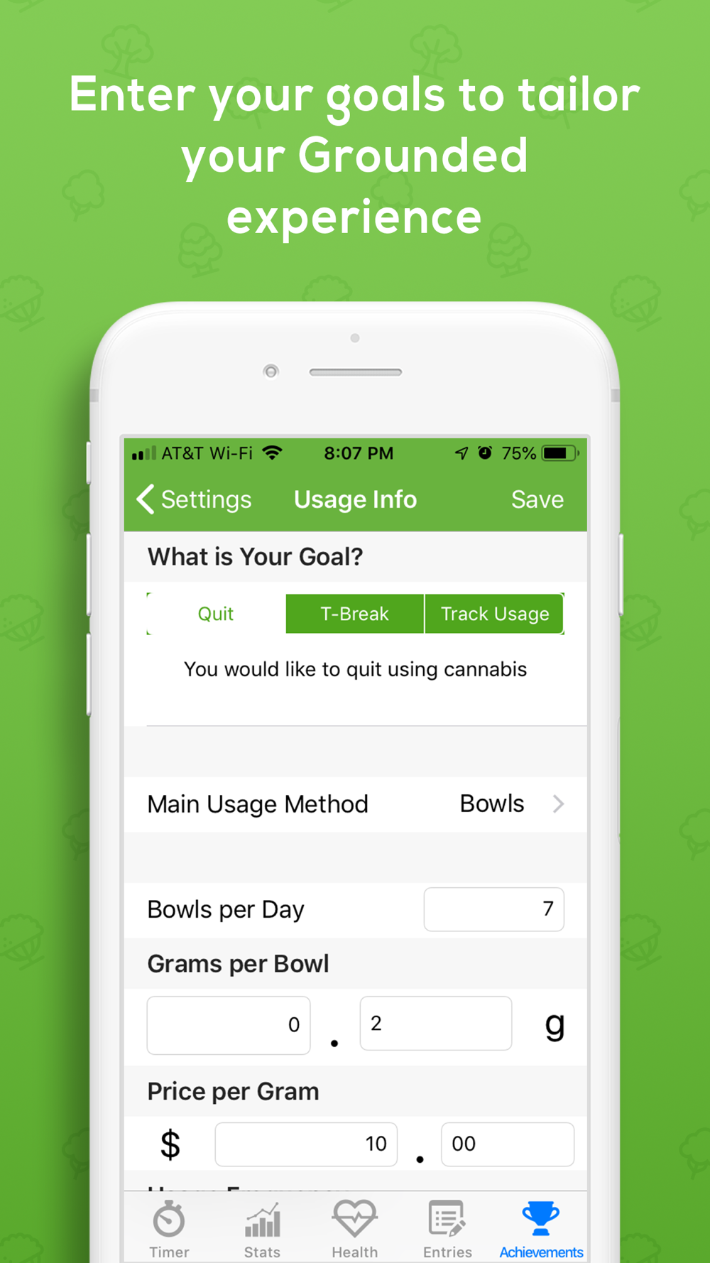 We also recognize that some users who would like to use Grounded are not life long ganja quitters but may just want to take a short break to increase their tolerance, or to flush the THC out of their system. So besides stop smoking trackers, we have provided tools to help them track breaks also. Grounded provides all the quit tracker tools and resources needed for all our 420 friends on all sides of the 420 spectra. With our weed tracker and quit smoking app you are in complete control of how you consume your weed.