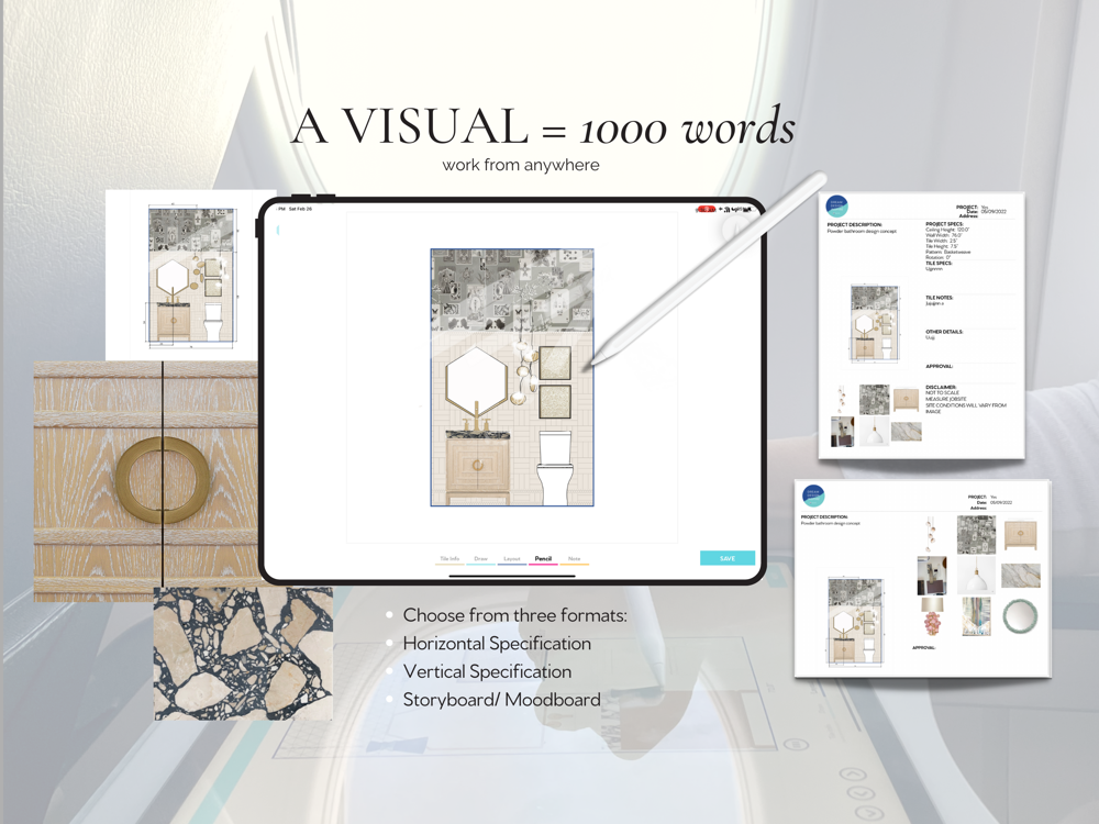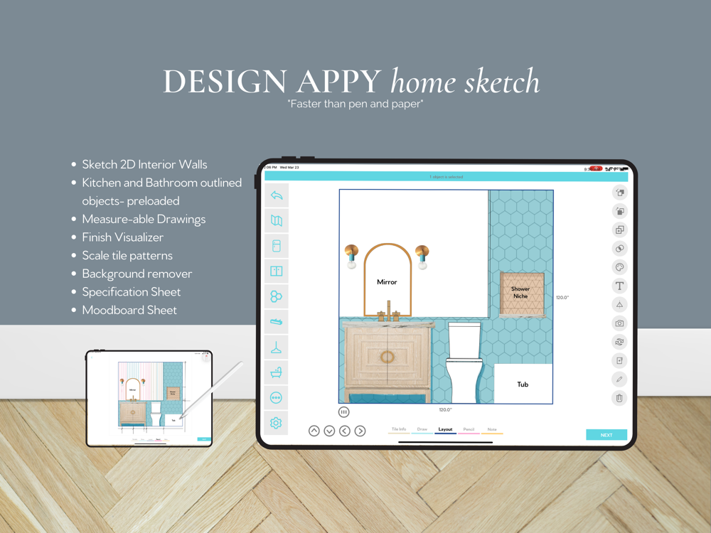 Design Appy communicates the look and style of a home design quickly, to scale and with great visuals. Create tile installation drawings, place light fixtures and note how you want your space designed to hand off for construction.
