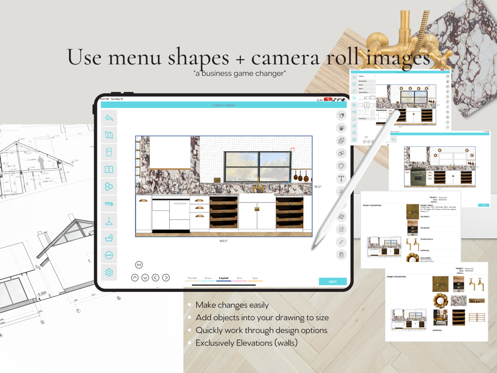 Images in your camera roll can be inserted into Design Appy elevations making resources always at your fingertips. Place images of wallpaper, tile, countertops, or textiles into the scale elevations and see 2D Images of home design come to life. Either a quick home fix, full-remodel, or new construction Design Appy is the interior design tile drawing app for you. Conceptualize, draw designs, and make decisions after seeing it in the space. Do you need help getting organized with the selections your client approves? This will help streamline your process. Design Appy is a fast learning design app.