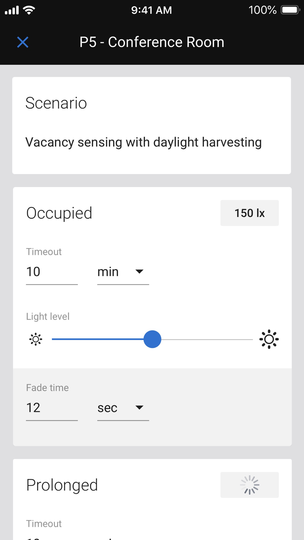 Select from preconfigured industry standard lighting control scenarios, and then customize them to meet your needs. Personalize run, prolong, and standby modes for occupancy and vacancy, plus other lighting control parameters.