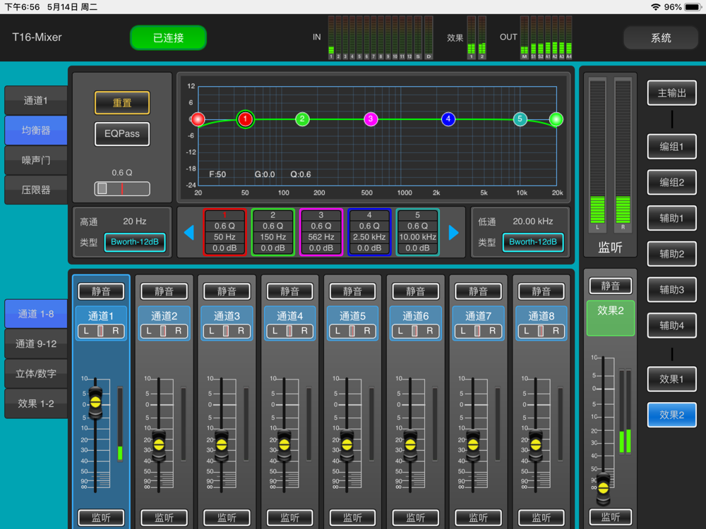 •・内置噪声门,压限器,高低通,5段参量均衡,延时,输通道声像平衡调节