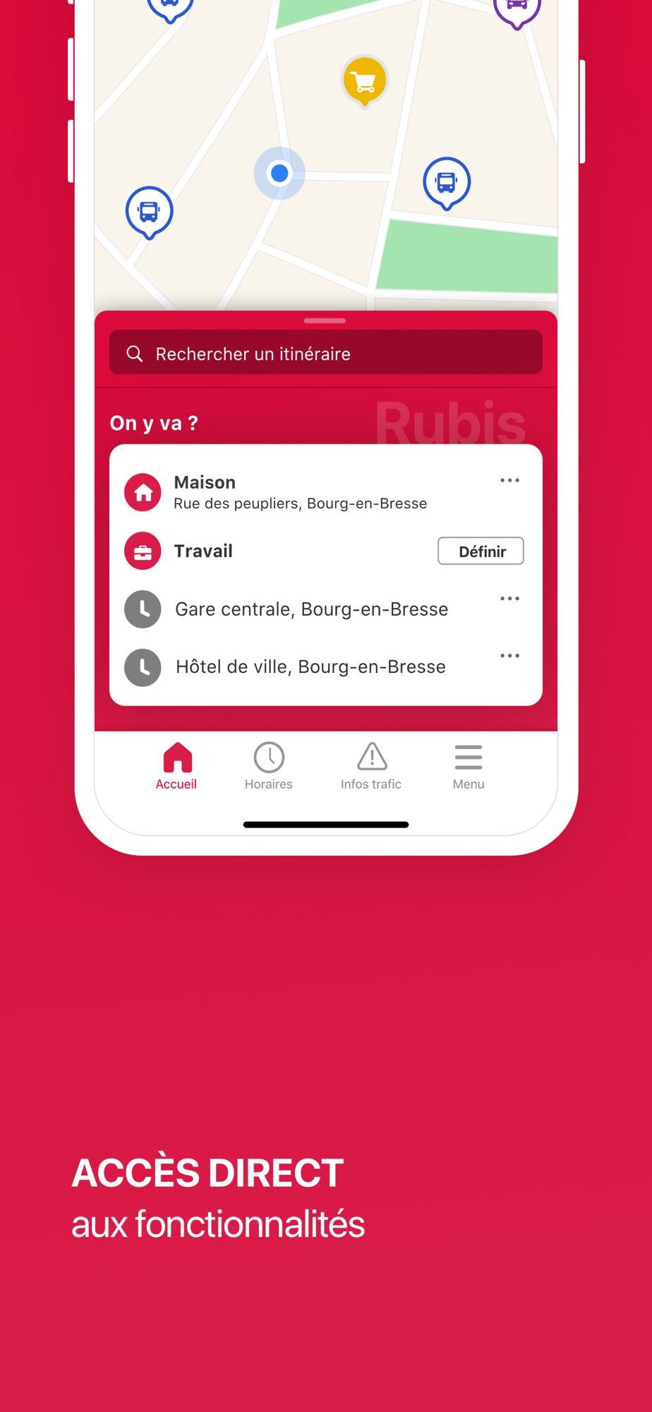 Rubis est l'application officielle et gratuite du réseau. Optimisez vos déplacements sur l’ensemble des 74 communes de l’agglomération du Bassin de Bourg-en-Bresse.