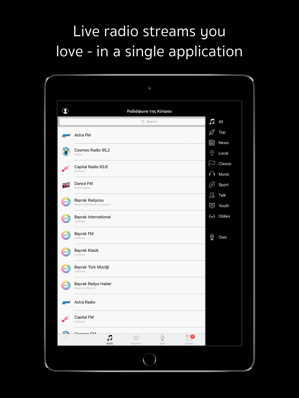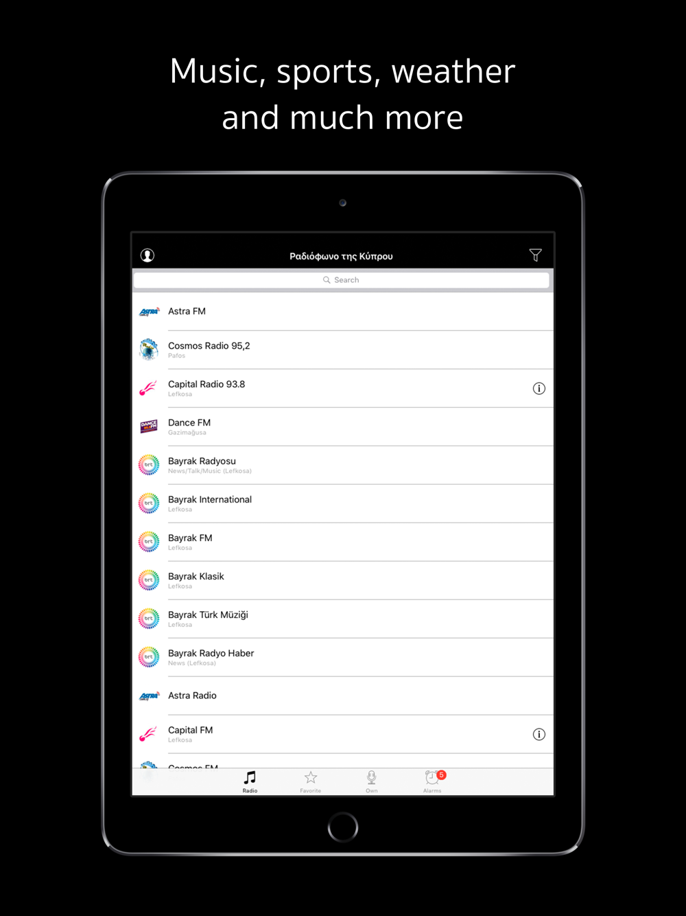 With Ραδιόφωνο της Κύπρου, you can easily listen to live streaming of news, music, sports, talks, shows and other programs of Cyprus. Ραδιόφωνο της Κύπρου offers tremendous depth and breadth of stations with genres ranging from Alternative, Electronica, Metal to Jazz and Classic across a broad set of languages including Italian, Spanish, French, German, Russian and Portuguese. At the same time, application has public radio, talks about business and analytics.