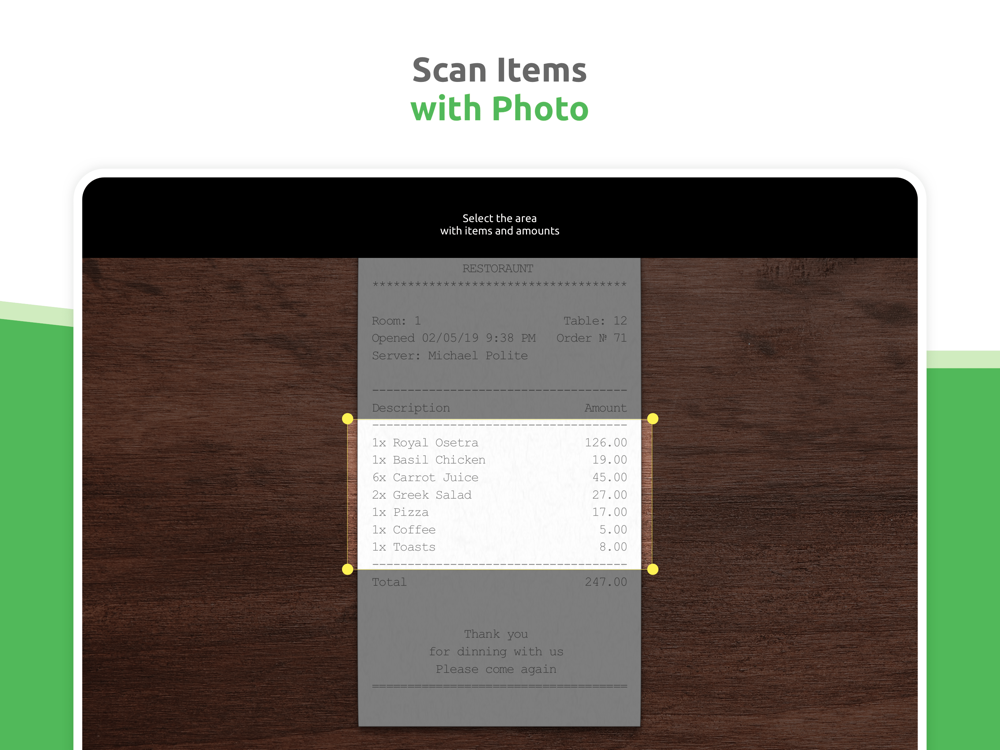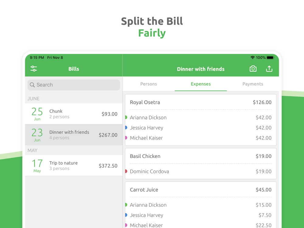 Your assistant to quick & fair bill splitting. The app calculates "who ate how much" and generates a report "who owes to whom?".