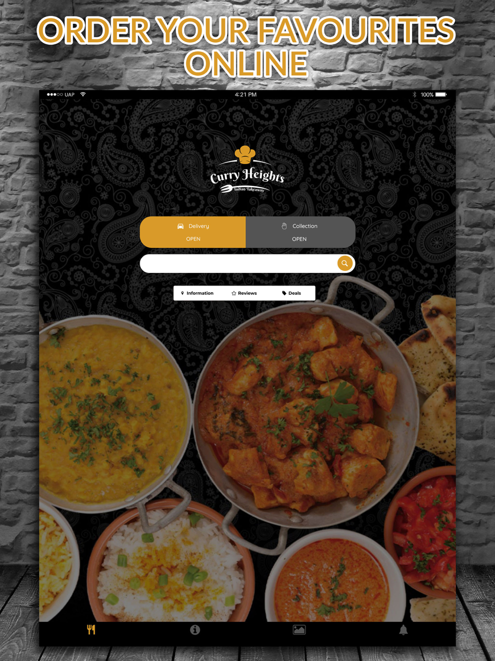 Order your favourite Curry Heights food online using our new app. With a delivery option available our easy to use system allows you to order and pay for your food from our full menu, all online and at your convenience from the comfort of your home. Alternatively, if you want to collect your order then you can do that too! You can also register for an account on the app, which will speed up future orders as well as allow you to reorder your favourite food easily. You can also receive exclusive offers and updates direct from us.
