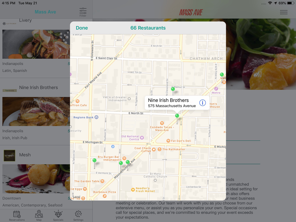 • Specials - We collect each and every new social media post through Facebook and display them all on one simple page for users to see what's happening on Mass Ave right now!