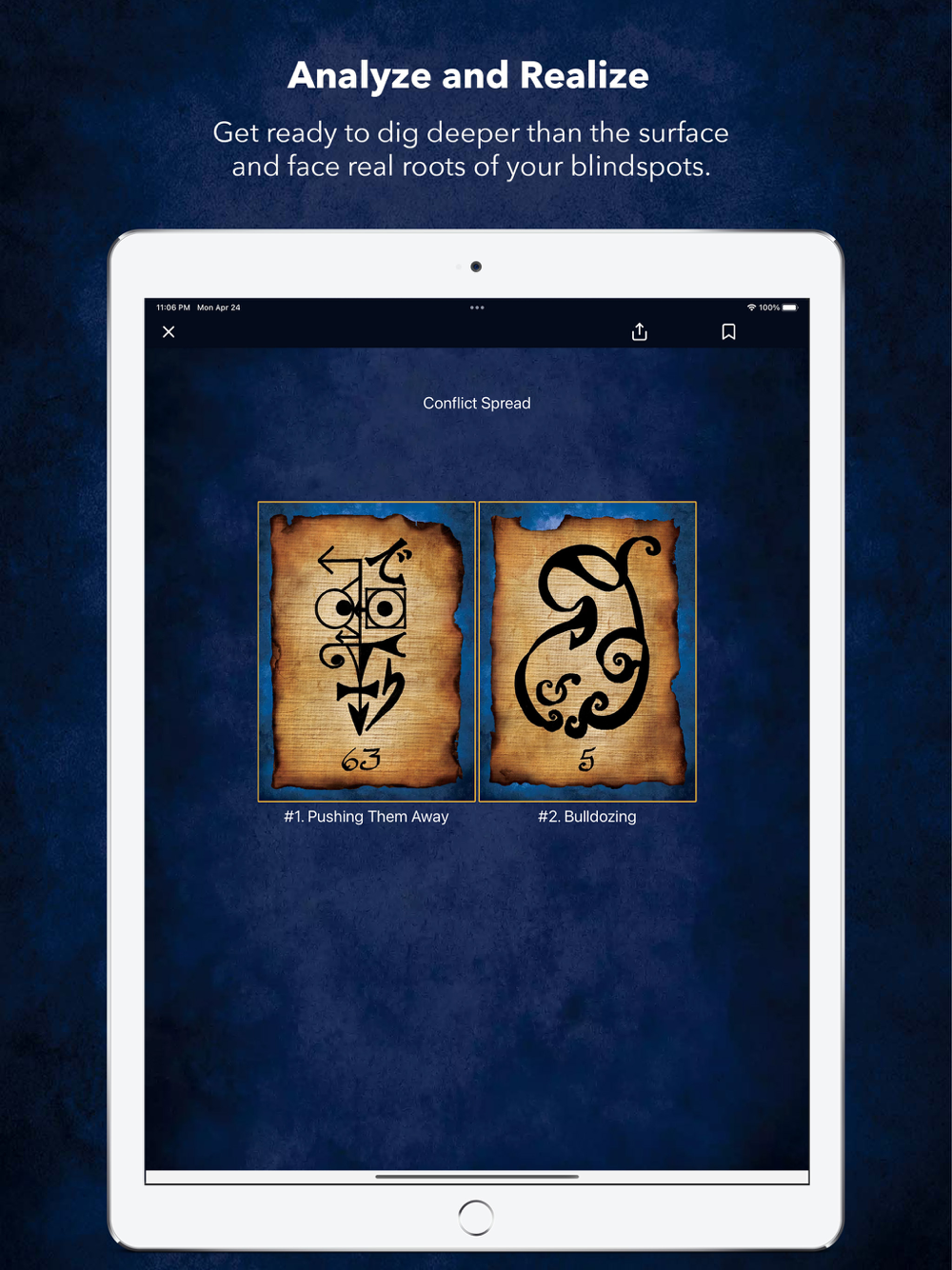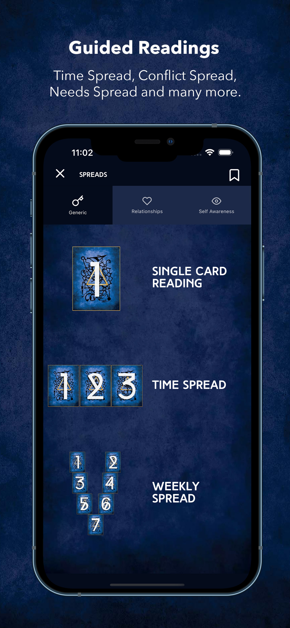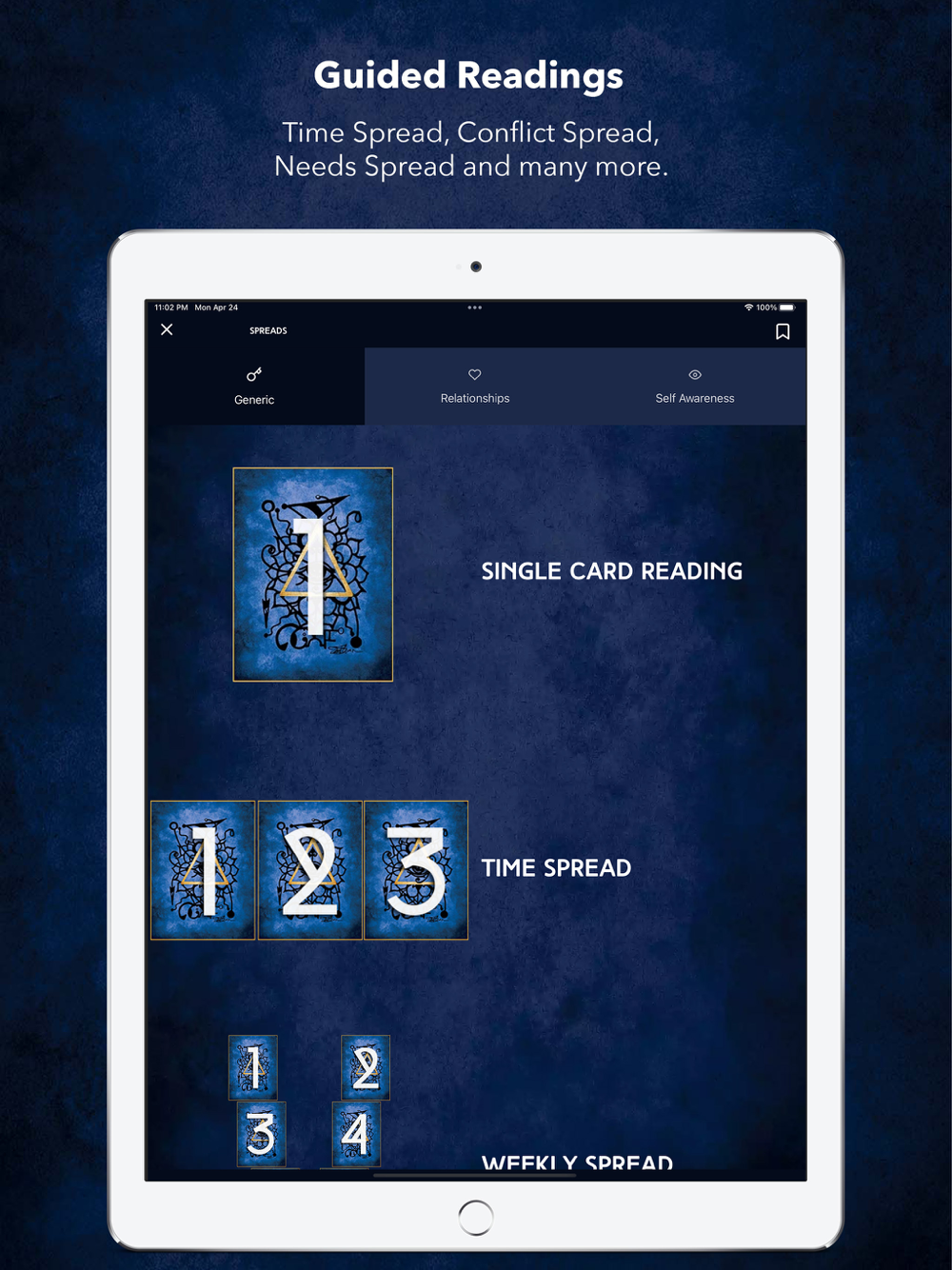 4. Guided Readings - the app features unique never before seen spreads that help you gain awareness on a topic like - your needs, wants, conflicts, blocks on giving & receiving love, physical body, etc.