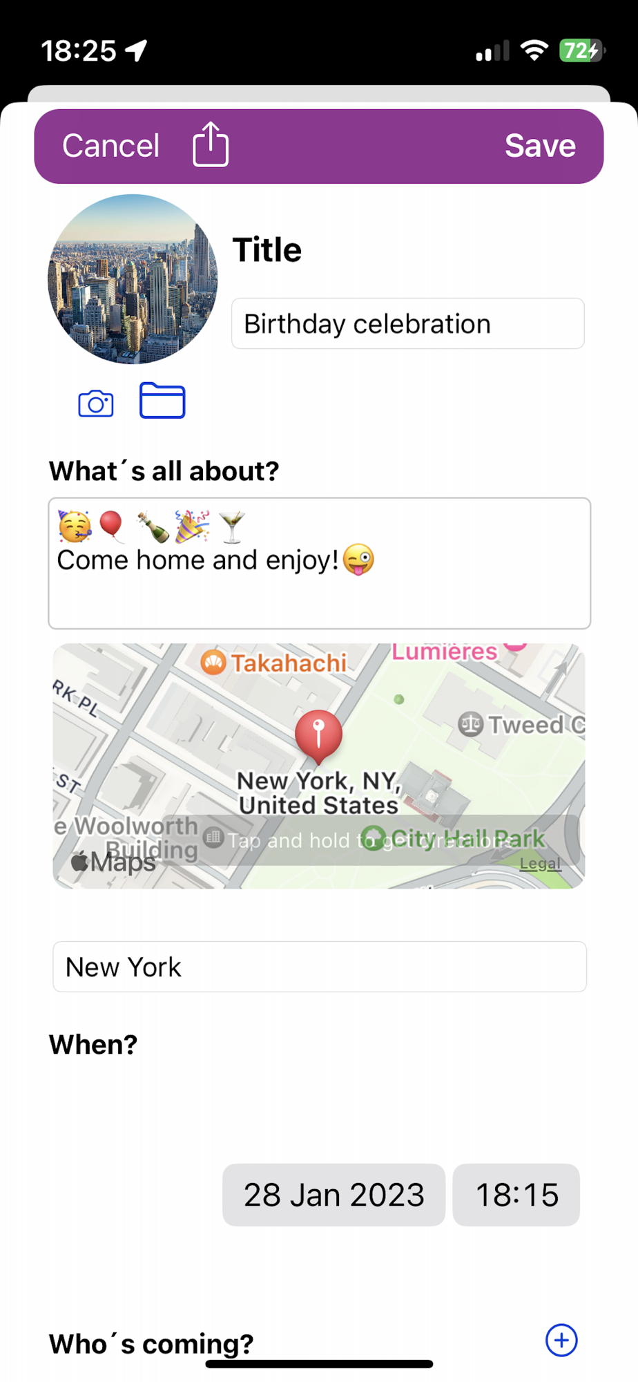 Create all kinds of events and share your location on a map with your friends, colleagues or family.