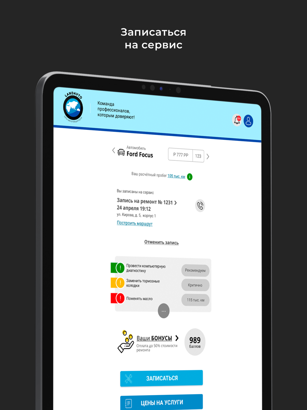 Специально для Вас мы разработали это мобильное приложение, которое позволит записаться на ремонт вашего автомобиля, просмотреть историю обслуживания и оставить отзыв о работе, получать бонусы, а также многое-многое другое.