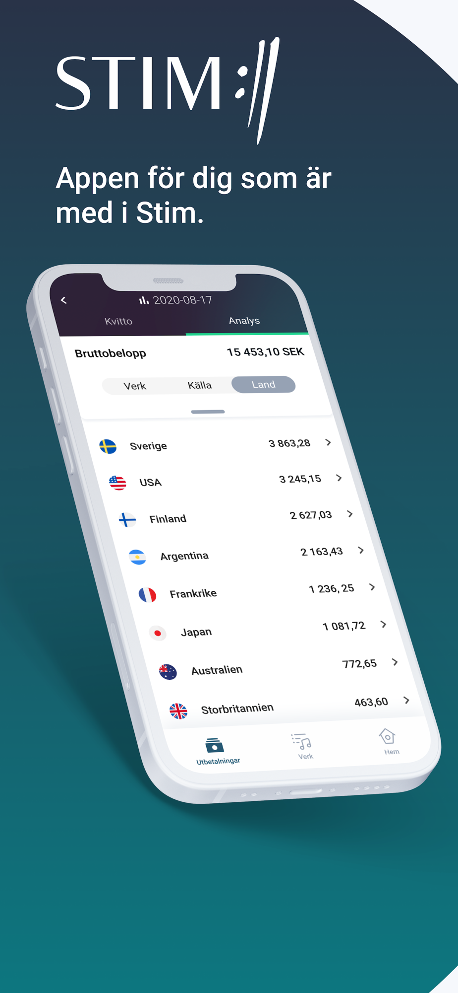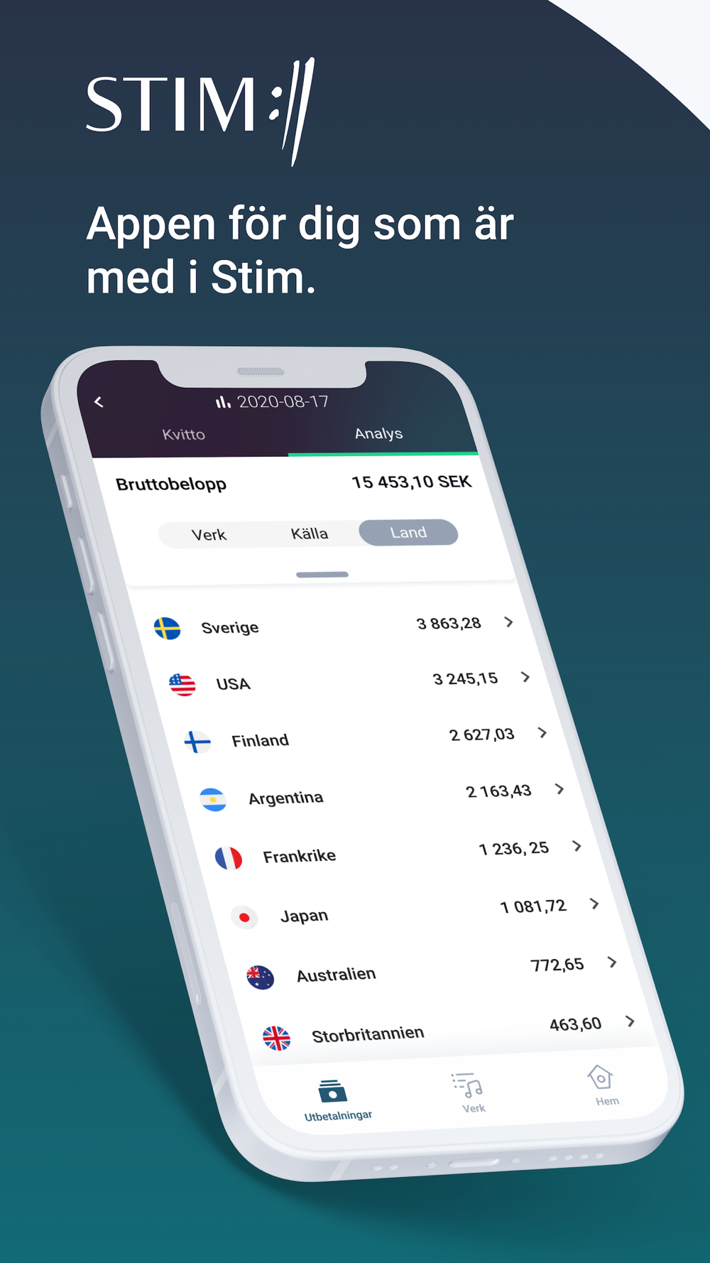 Utbetalningar - I appen finns dina utbetalningar från Stim samlade och genom analysfunktionen kan du gå ner på detaljnivå. Kolla in vilka verk som du har fått mest pengar för, se dina intäkter uppdelade i musikkällor och vilka länder som toppar din lista.