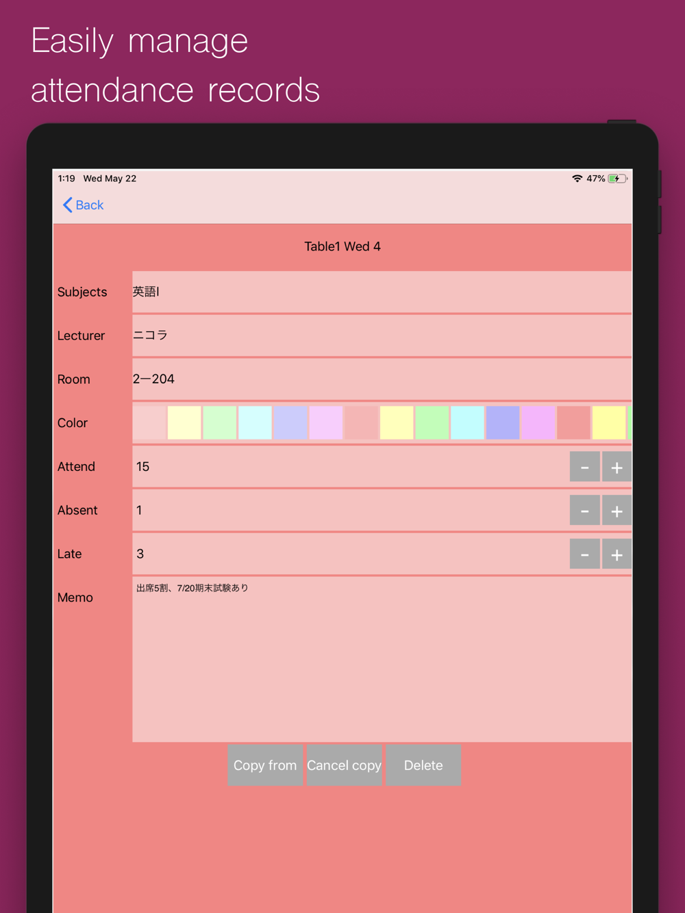 You can easily record the number of attendance, absence and lateness by tapping the button.