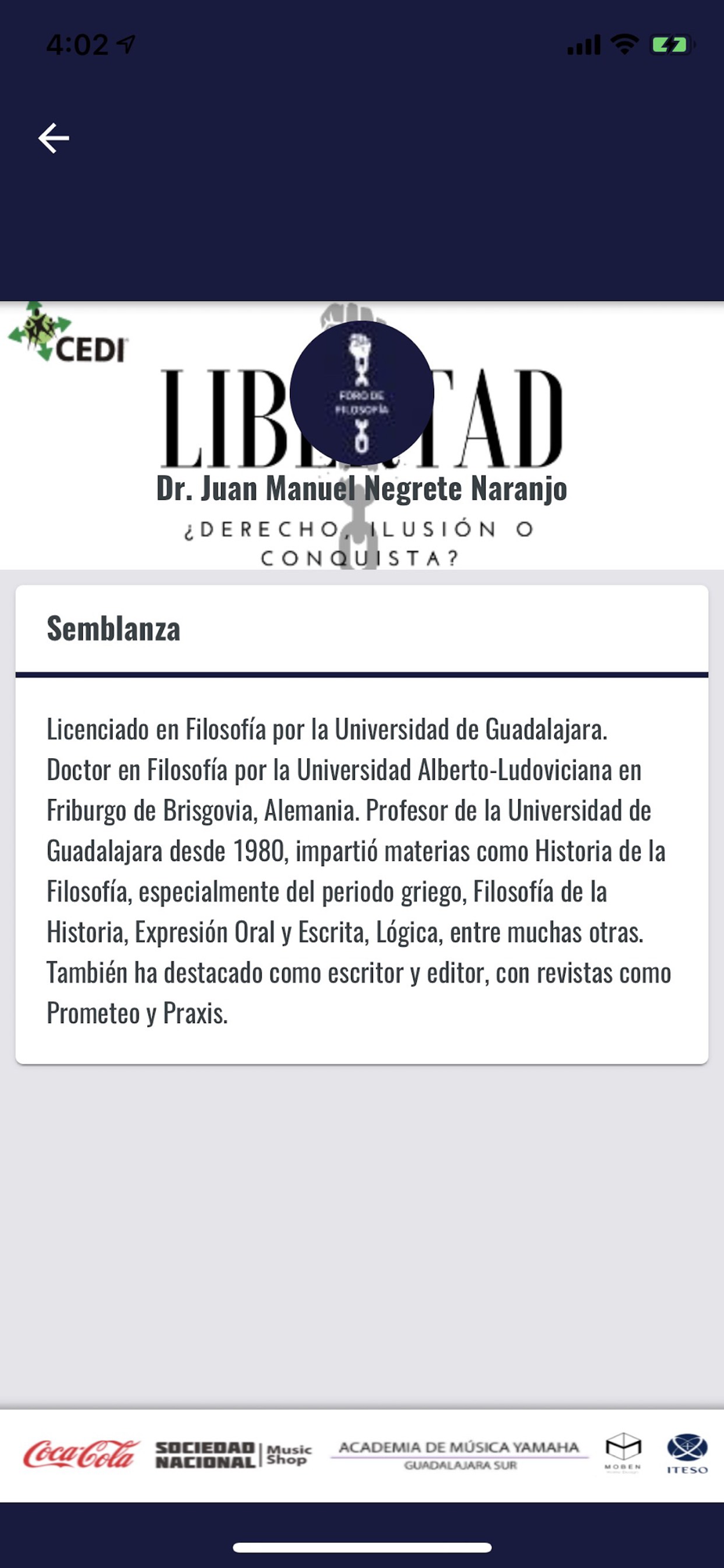 Utiliza la aplicación para enterarte de los eventos importantes en el Foro de Filosofía 2019. Desde como llegar al evento, hasta revisar la agenda del evento, los presentadores y las mesas de trabajo de las que formarás parte.