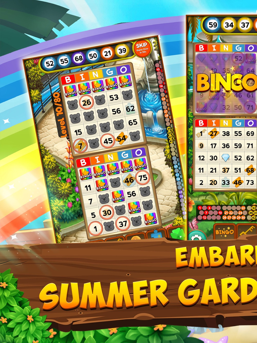As you progress through our free bingo live game adventure, you’ll have the chance to explore new areas in the land of four seasons. Adore the summer birds and waterfalls along your bingo journey and, with 80 levels of free bingo waiting for you in the gardens, you’ll have hours of fun in this beautiful garden land! You can even play bingo games offline!