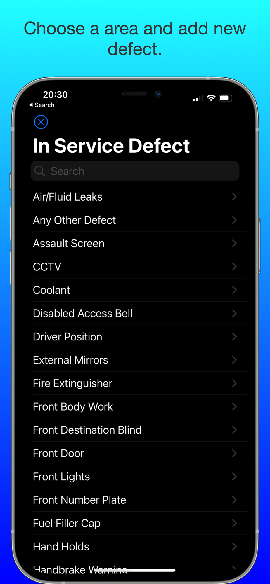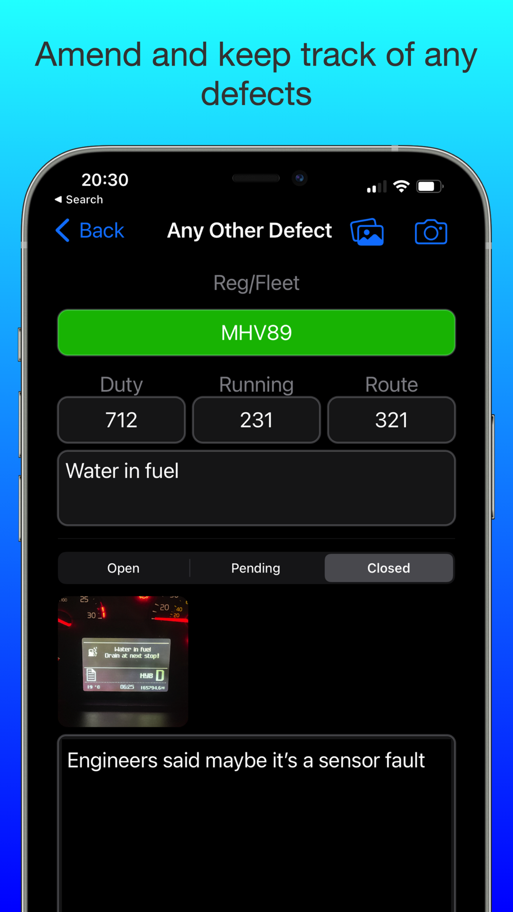 • You can keep track of defect that you found on the vehicle. You can add photos and additional notes.