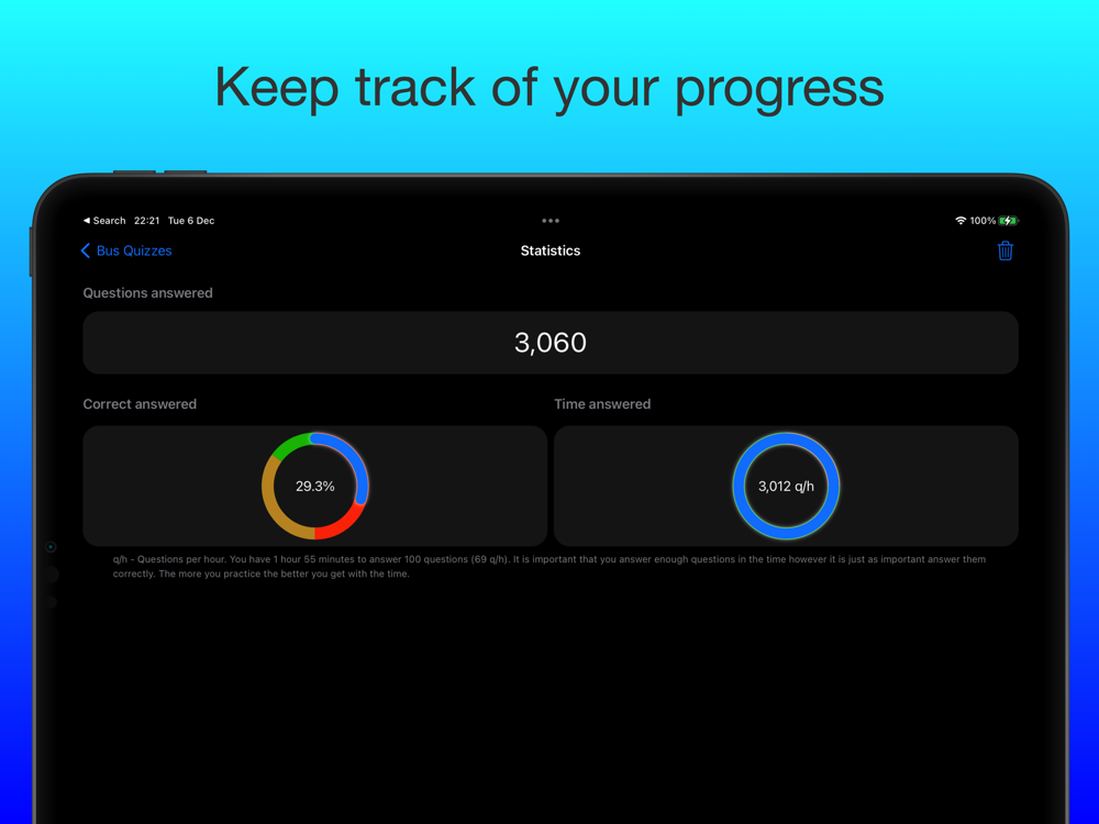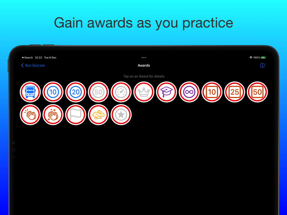 Preparation for the theory test is in the form of a quiz that has over 1350 questions that you can do either as a quick quiz, a full test of 100 questions, or by answering them all. You can keep track of how you are doing and collect “Awards’ along the way. You can have widgets on your “Home” screen (medium, large or extra- large for iPads) that ask random questions