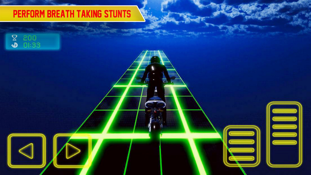Crazy Bike In Light Tracks is all about bike balance, skills and insane stunt action. Welcome to the stunt driving competition held in a beautiful light impossible tracks environment. Which would be difficult to over come , but if you think quick and have quick reflexes this game would be very easy for you. You can choose from different bikes, some are heavy bikes some are scooters and then one futuristic prototype which you can unlock through playing the game. Are you ready to show daredevil stunt skills and want to taste of spine-tingling adventure to become a master bike stunt? Live life on the edge and amaze everyone with your stunting skills while executing of some dangerous stunts.