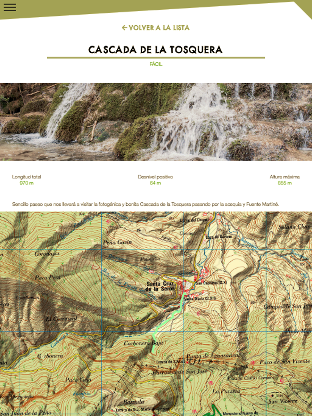 En esta aplicación encontrarás 15 rutas de senderismo en el entorno de Santa Cruz de la Serós, en Huesca, de diferentes niveles de dificultad y longitudes. Todas ellas con descripción detallada, mapa, imagen del perfil, track para seguir con google maps, gpx para descargar y enlace a la ruta en Wikiloc. Disfruta de estos paisajes encantados y cuida la naturaleza.