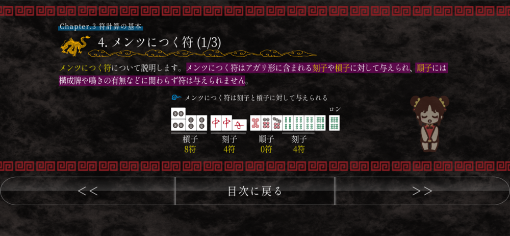 このアプリは基本的なルールと役一覧は覚えたけれど、まだ点数計算はできない/自信がないという方に、なるべく分かりやすく、麻雀の点数計算の方法を理解していただくために作成したアプリです。