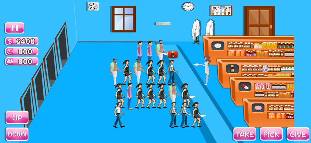 Your patients are in need of medication. Get behind the pharmacy counter and fill their medical prescriptions as fast as you can. Use the buttons UP and DOWN to move the pharmacist at the drug store and press TAKE to grab the prescription, PICK to learn, find and get medicine from the respective isle and GIVE button to hand the medicine to the customer.