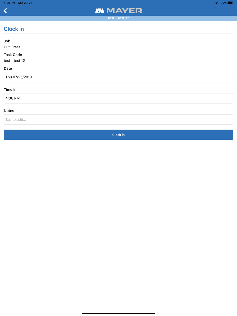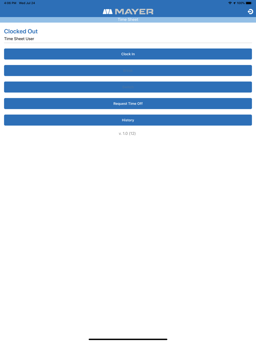 Mayer’s Time Sheet app provides our customers the ability to manage their associates' timesheets, process and track time off requests, and provide customized reporting. With this app, employees will have the ability to clock in and out, schedule and document breaks, request time off, and even change their task/job codes for a given project. Managers can then quickly access real-time payroll information and calculate labor cost for a given job or project. If you are a Mayer customer and interested in streamlining certain payroll functions, please contact your Mayer sales representative.