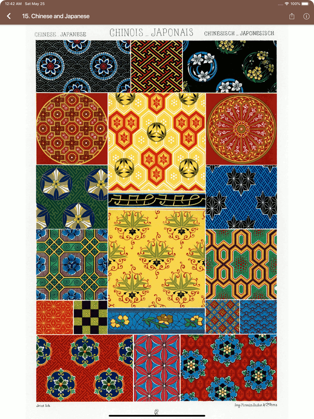 These 100 plates include more than 2000 specimens of design from cultures all over the world, through Antiquity, Middle Ages, Renaissance, 16th, 17th and 18th century, and from various mediums such as painting, textile, metalwork, woodwork, architecture, jewellery, ceramic, mosaic...