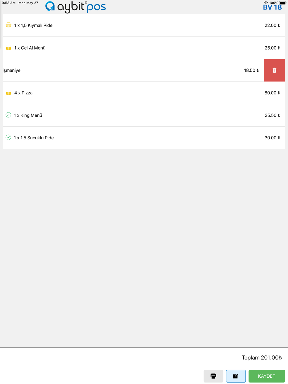AybitPos - Siparişler, Restoran otomasyonu el terminallerinin yerini tutacak mobil sipariş uygulamasıdır. Kolay kullanımı sayesinde garsonlarınız siparişlerini masa başında rahatlıkla alabilir. Mutfak yazıcılarına ürünleri gönderebilir ve adisyon çıktısı alabilir.