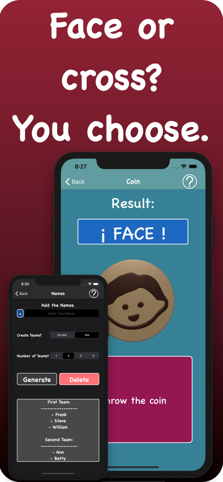 Random Name, will help you obtain random numbers or names, as well as the use of two options like face or cross ?, or the use of dice to obtain a number.