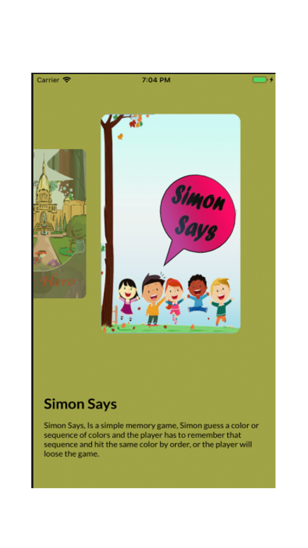 5- Simon Says: Is a simple memory game, Simon guess a color or sequence of colors and the player has to remember that sequence and hit the same color by order, or the player will loose the game.