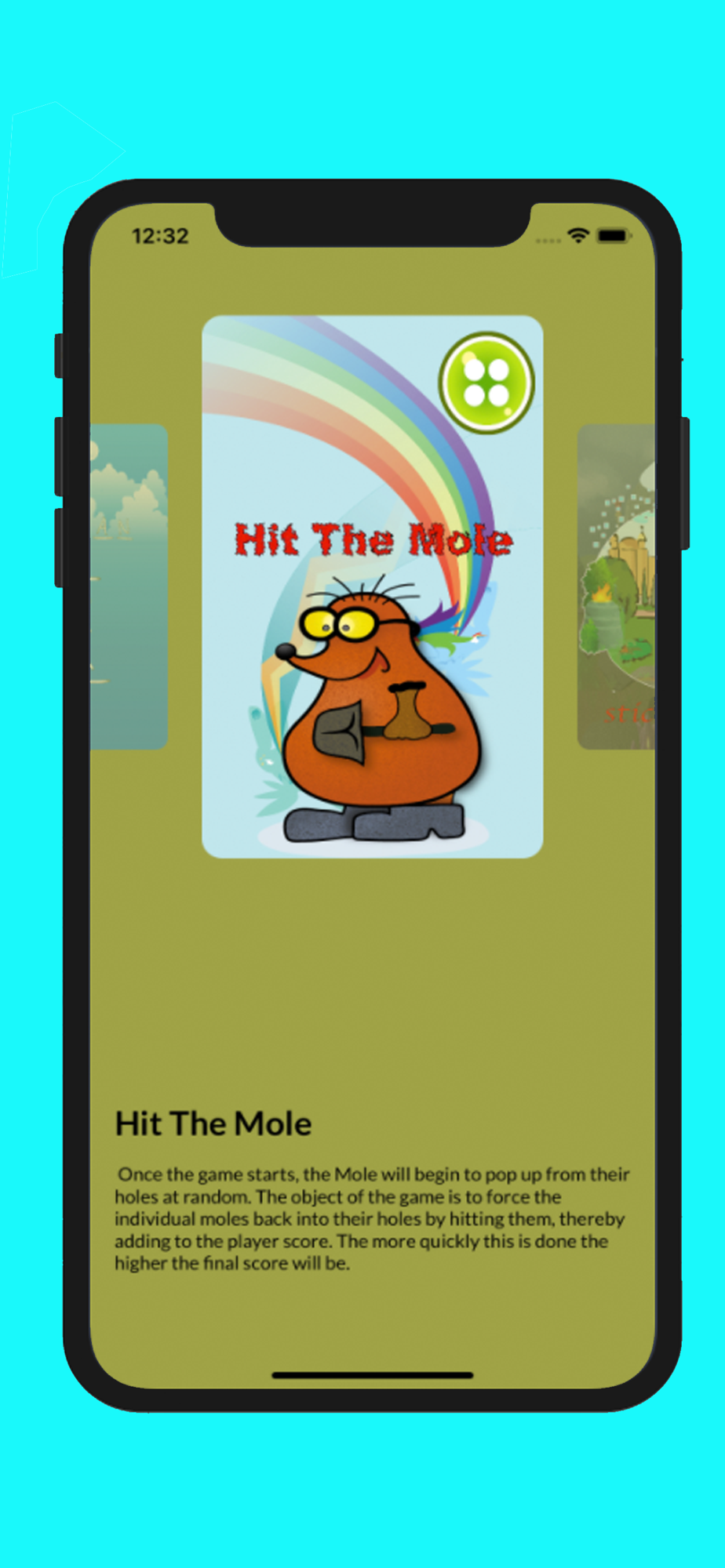 3- Hit The Mole: Once the game starts, the Mole will begin to pop up from their holes at random. The object of the game is to force the individual moles back into their holes by hitting them, thereby adding to the player score. The more quickly this is done the higher the final score will be.