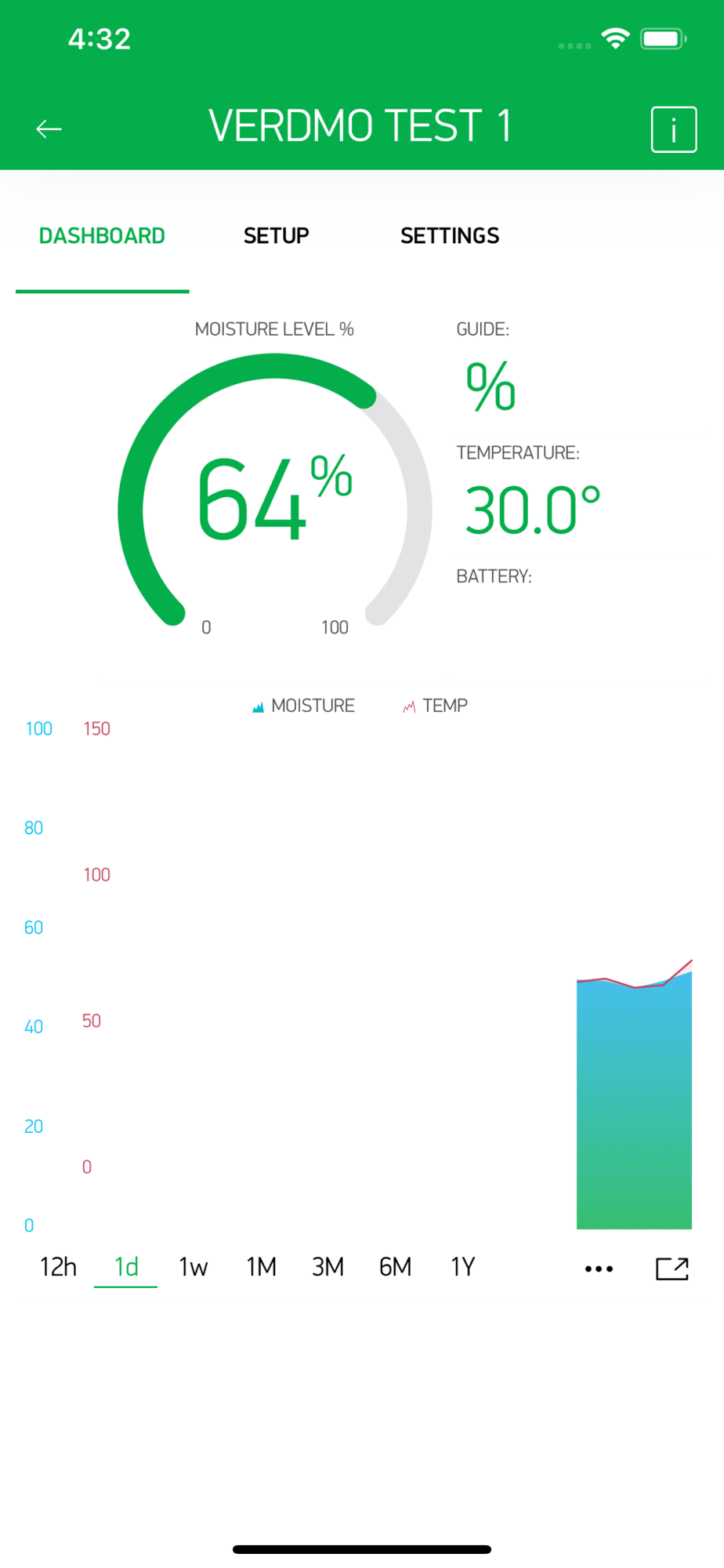 ● Dashboard - See Moisture Level, Guide, Temperature and Battery level all at a quick glance.