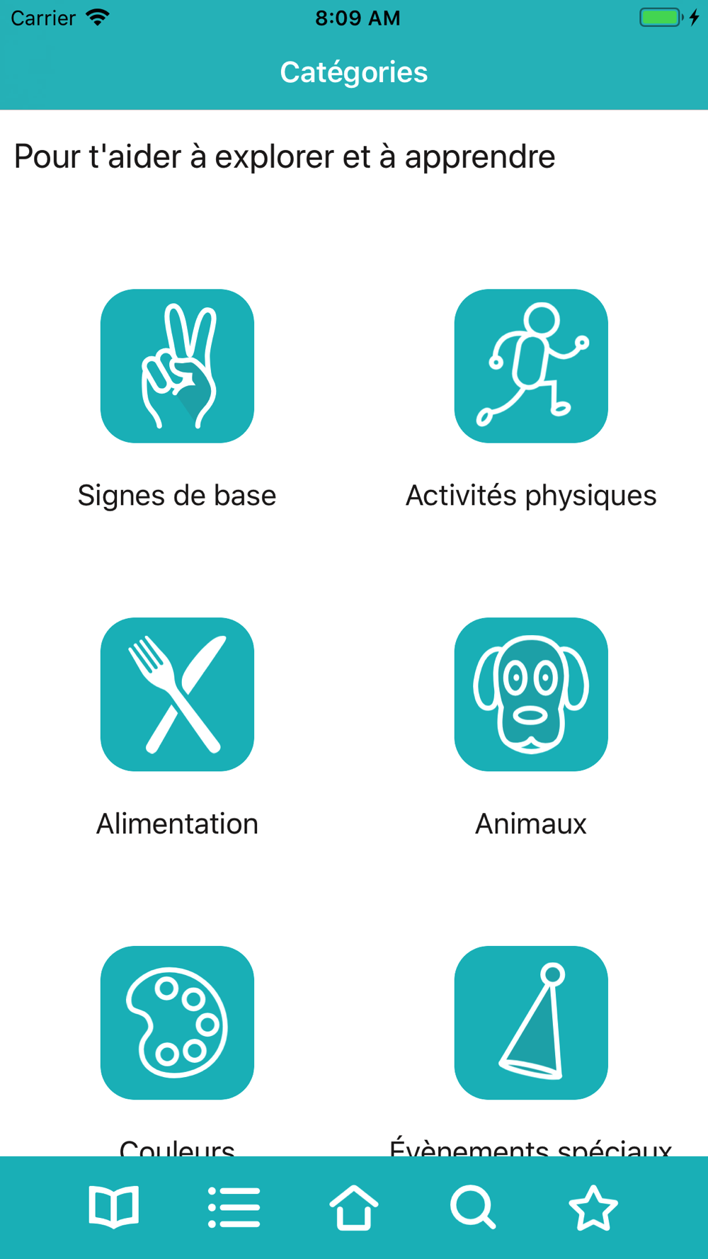 - Par thèmes (Alphabet, Nombres, Alimentation, Couleurs, Métiers, etc.), avec l’ajout d’une centaine de phrases en LSQ!