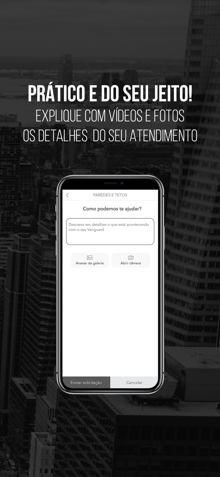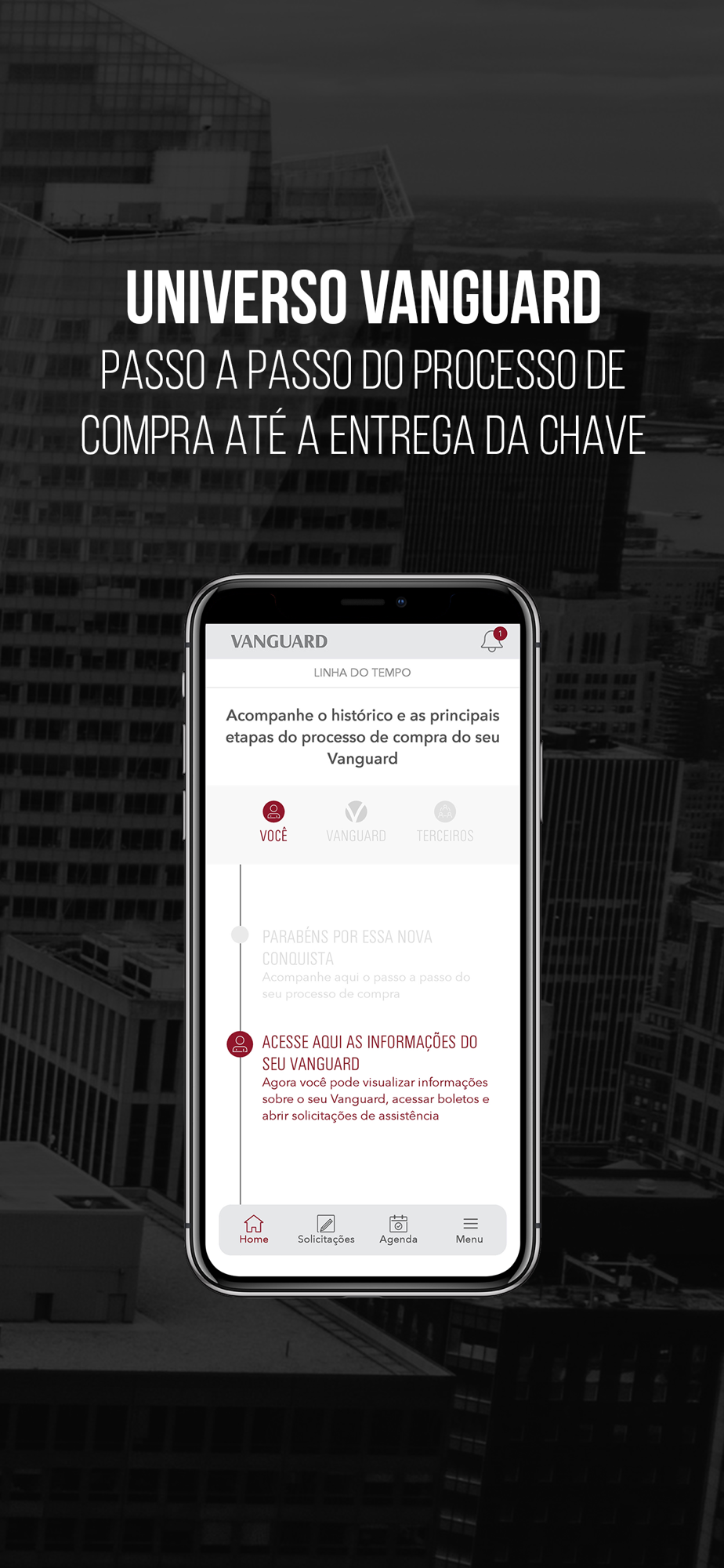 De onde você estiver, poderá conferir a timeline que traz o passo a passo do processo de compra até a entrega das chaves, tirar dúvidas e acompanhar cada etapa da construção do seu Vanguard. Além da possibilidade de iniciar um atendimento para negociação de parcelas e abrir, em poucos cliques, solicitações de assistência técnica ou financeira.