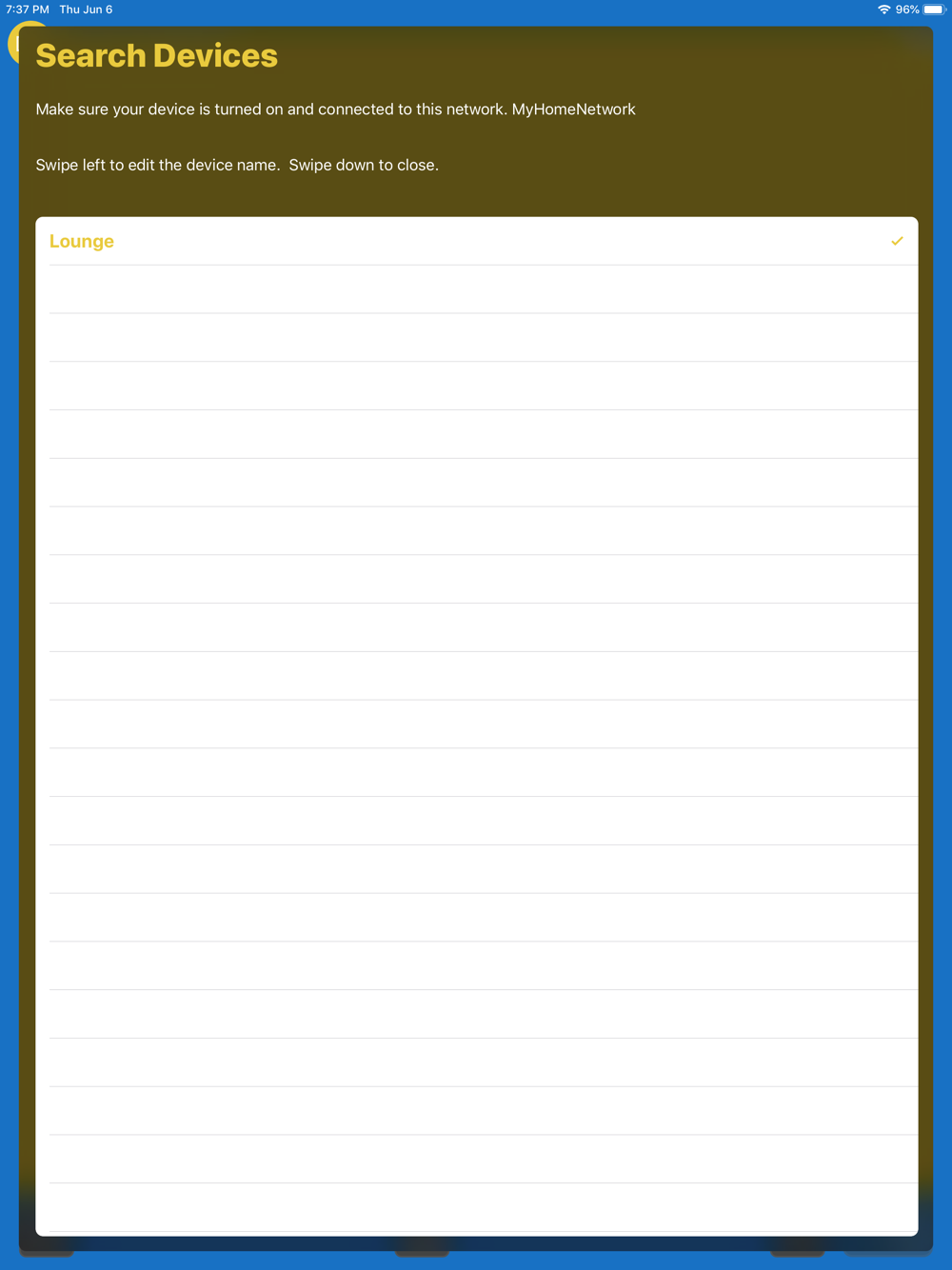 Simple to setup as long as your iOS® device is connected to the same network as your streaming device when you first run the app you will see your device in the device list. Just tap it to select it and then swipe down to close the device menu.