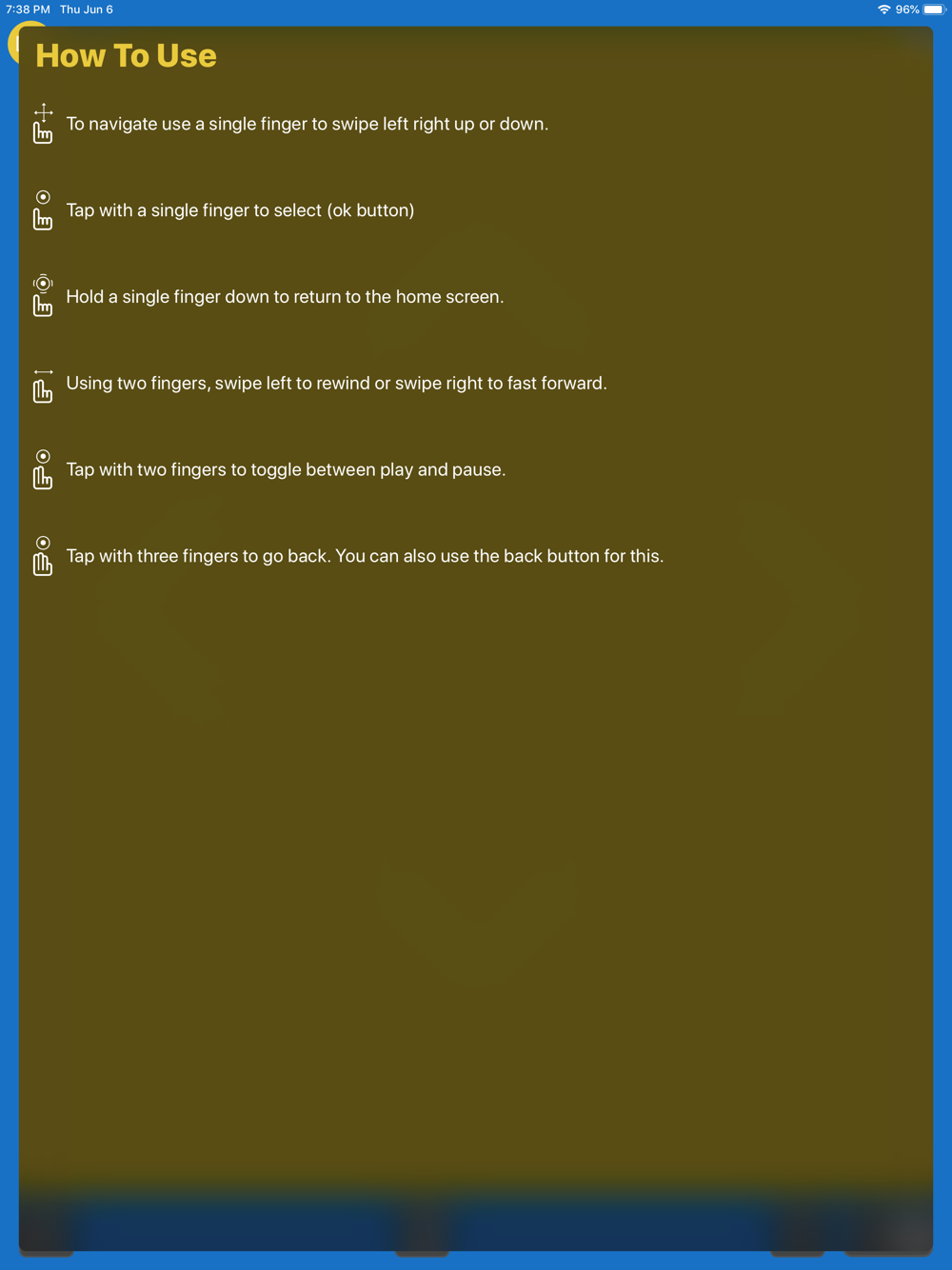 Swipe Remote uses a touch pad to control your device, others apps do this but many of them only control up, down, left, right and ok. Swipe Remote recreates 9 of the buttons from the remote as gestures you can perform on your device without having to look what you are doing.