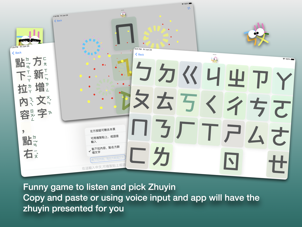 - Recognize and listen to bopomofo symbols, for simplified and traditional Chinese