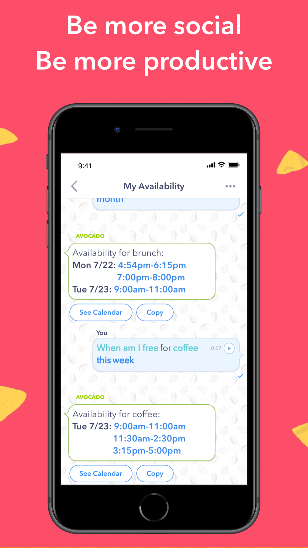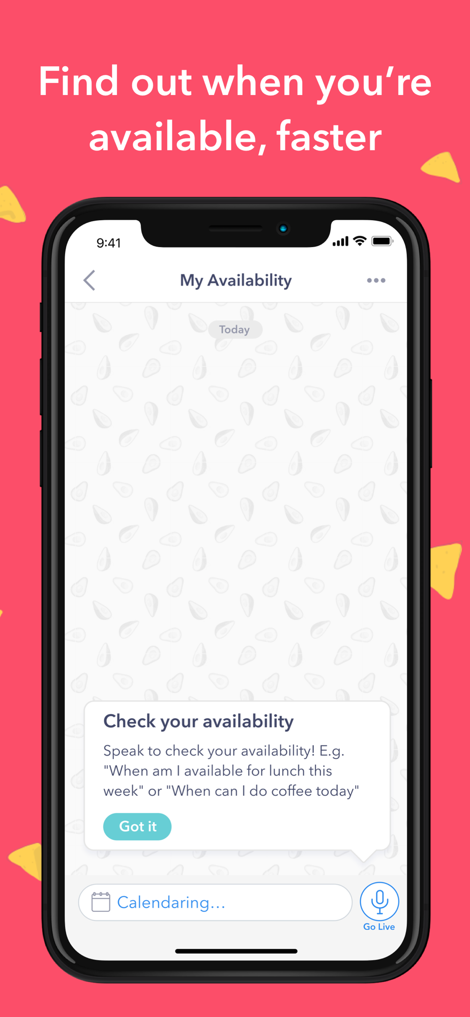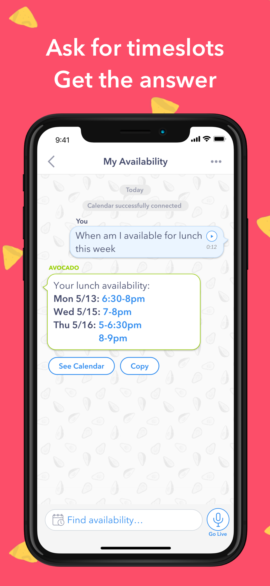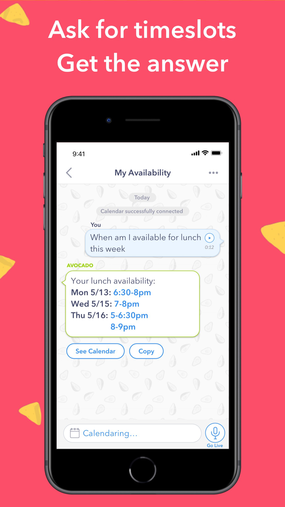 Voice is the fastest, easiest way to turn thoughts into actions. “When Am I Free, Avocado” lets you ask Avocado to find open time slots for lunch, dinner, coffee, etc. and it's 10x faster than looking it up yourself. Give Avocado access to look at your Google Calendar and you can get answers faster than humanly possible. Get back to business faster with Avocado as your admin.