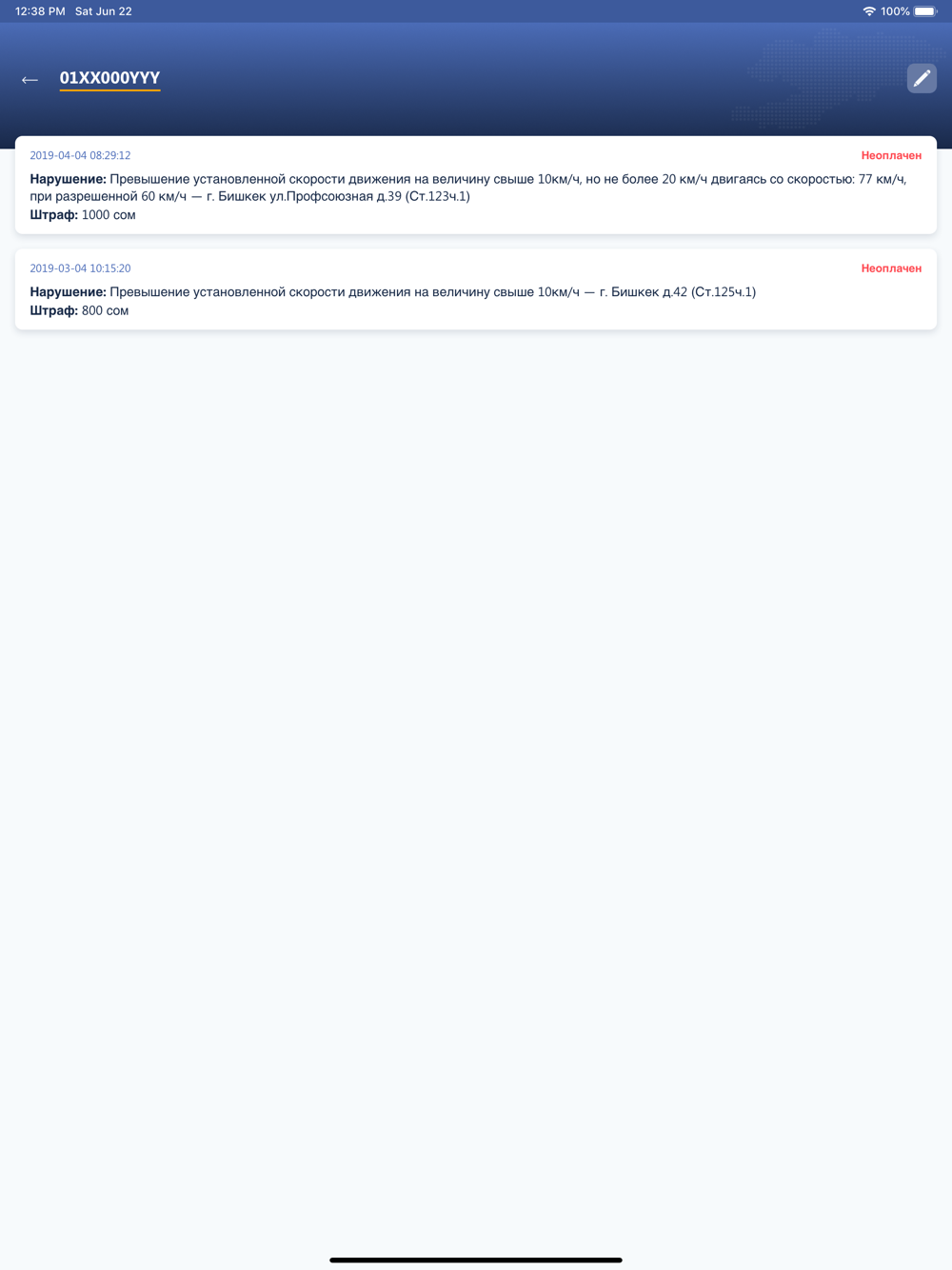 Штрафы ПДД КР - надежное приложение для проверки своих автомобилей на наличие штрафов. Приложение своевременно уведомит Вас, если будет зарегистрированно нарушение. С помощью нашего приложения можно узнать детали и статус штрафа.