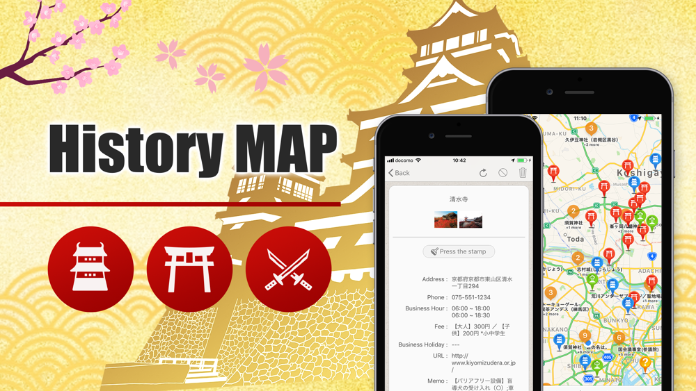 All pins registered on the map, such as castles, shrines, and historical sights, are navigated by GPS from the current location. In addition to walking, it also supports train and car movement, so you can go around the sights by your favorite means of transportation.