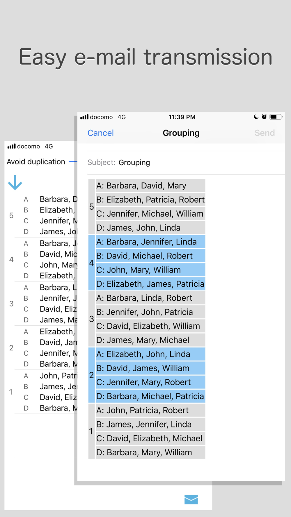When you press the E-mail sending button at the bottom of the grouping list screen, the mailer starts with the grouping result written in the text.
