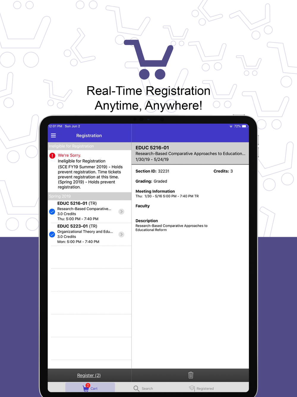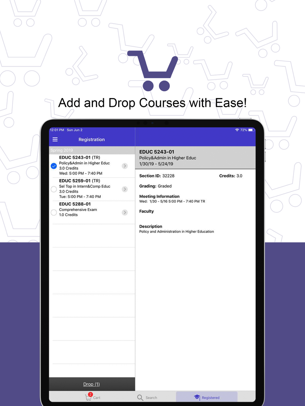 • Registration: Search and save courses to your cart in advance and when it’s time to register you are done in seconds with a tap of a button.