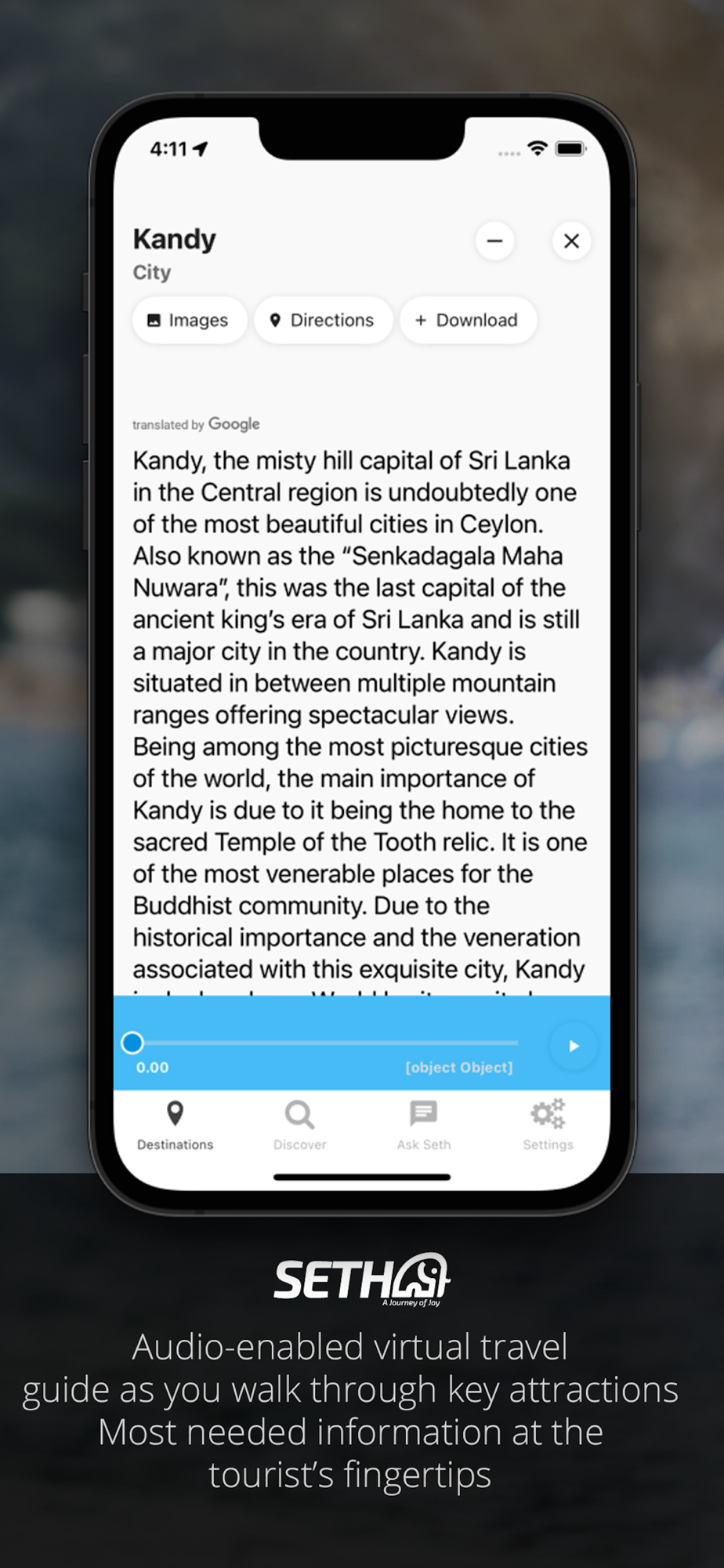So you might have figured this out by now...Seth is an app that offers you a new and interesting way of travel. It is a virtual travel guide that'll help you traverse the country by yourself or even with company. The app will assist you with audio-guided tours to places in your vicinity by location. And it doesn't stop at that - the app also offers a friendly chat service where you can chat to Seth for any quick assistance - he will provide you with useful information on demand, ranging from train, bus schedules to best times for visiting some key tourist attractions in the country, and a lot more information from useful telephone numbers to anything else that you as a tourist may need. So you know, its not just new and interesting, but definitely the safest, reliable and most efficient way to tour Sri Lanka.