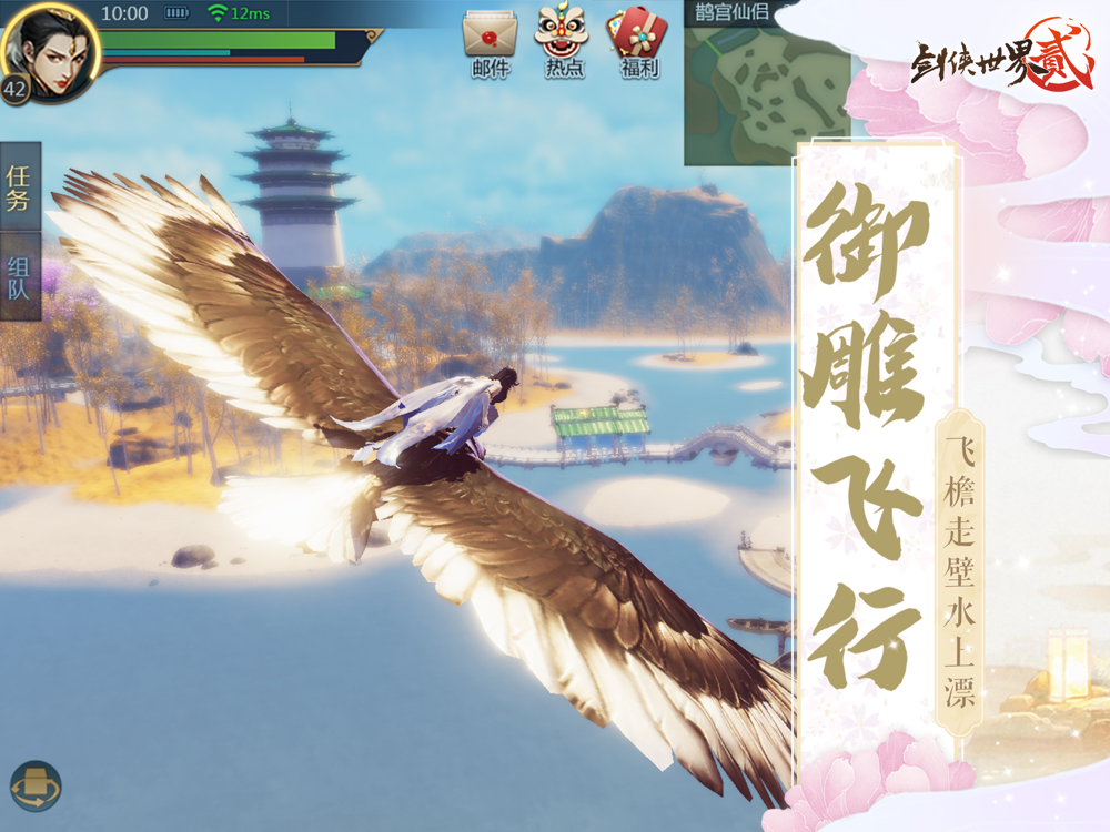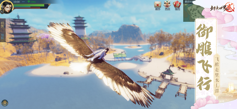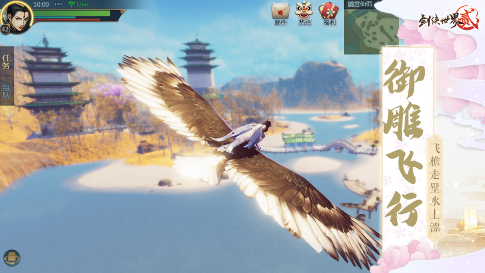 无轻功,不武侠。真实实现轻功飞檐走壁水上漂,四段轻功腾空飞行。创新设计御雕飞行,空中还可换雕,无缝纵览江湖美景。