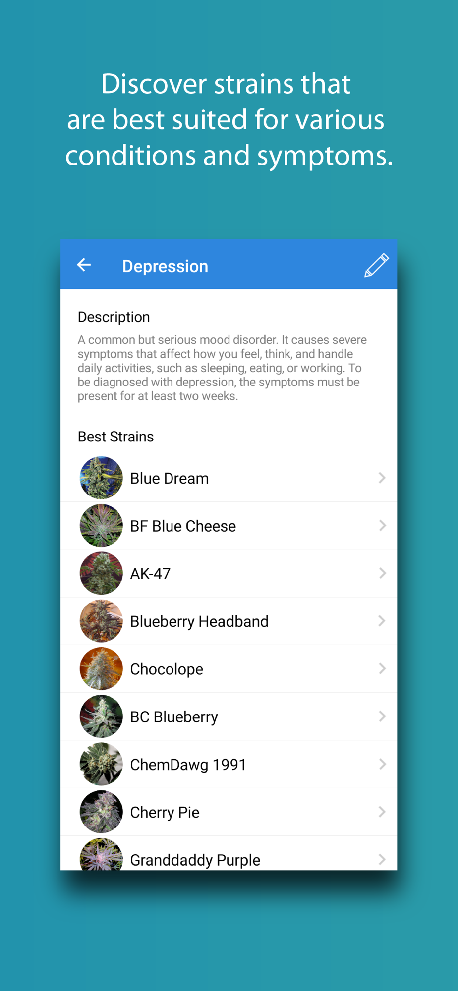 Weedi is a simple way to connect with your dispensaries and find all the cannabis strain information you need. Regardless if you are a new user or a seasoned cannabis expert, Weedi can help you document your cannabis experience and keep you updated on your favorite dispensaries. You can search through thousands of strains, follow dispensaries, and discover the latest products and deals in dispensaries near you. Save personalized notes and bookmark your favorite strains all in one place to easily reference it later. The app includes full strain descriptions, history, and reviews from cannabis experts and real users.
