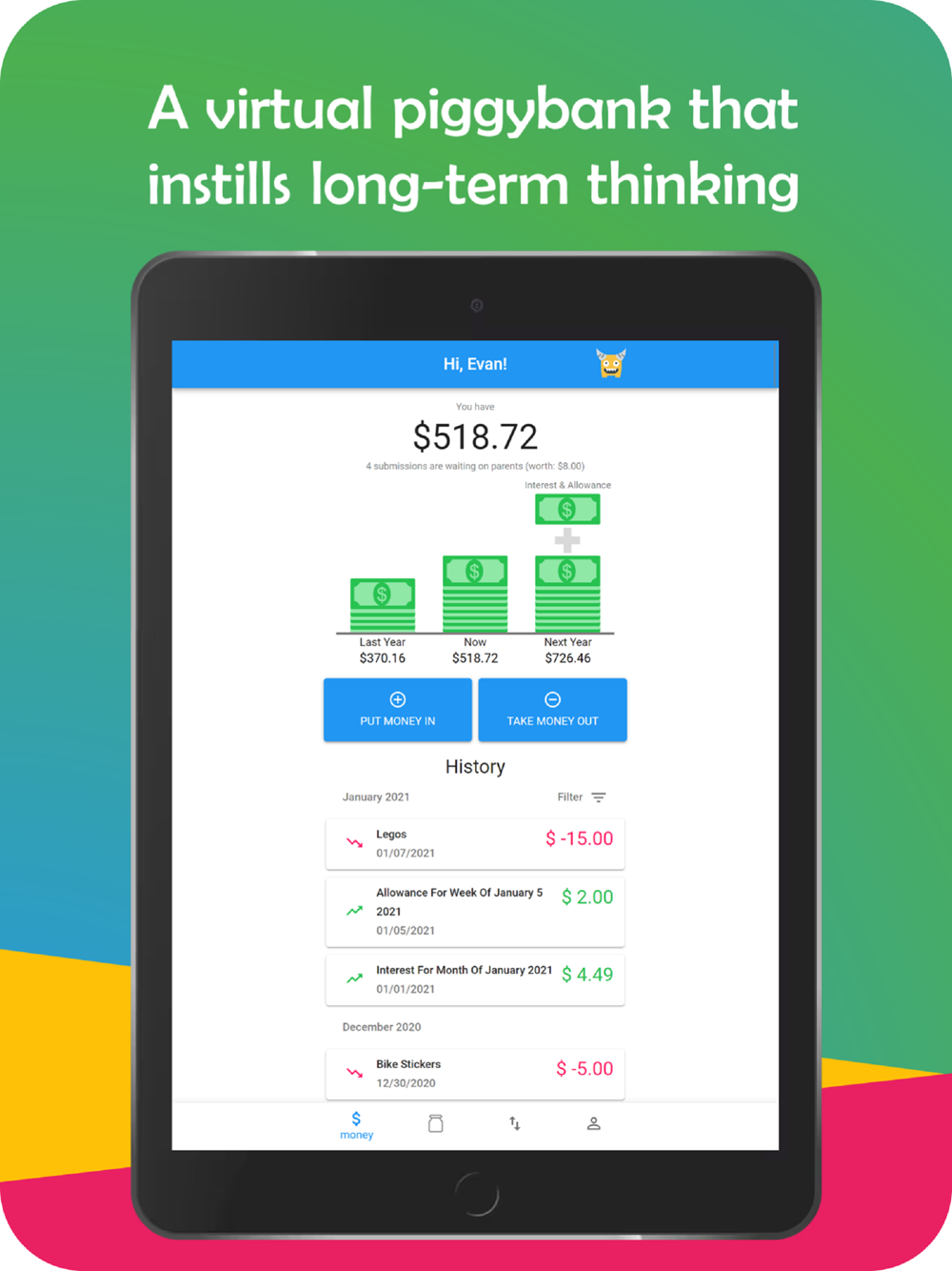 Replace the piggy bank with Guardian Savings. This app is great for paying kids for chores, using as an allowance tracker, pocket money management, managing family finances, teaching youth financial literacy, being the bank of mom and dad, and more! It may just be a money tracker but to your child, it feels like a kids bank.