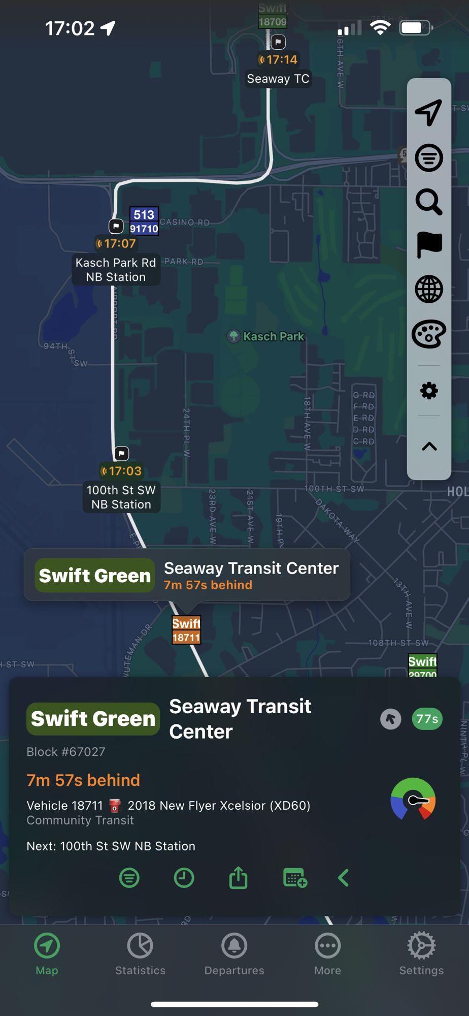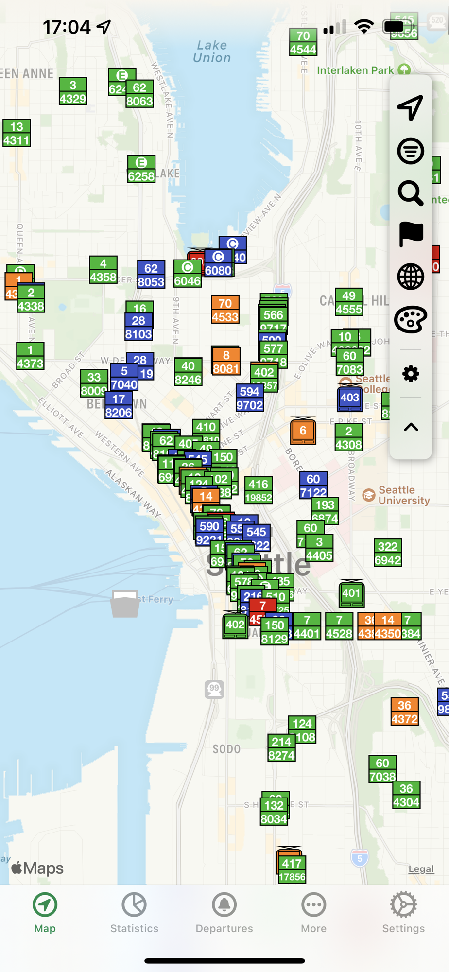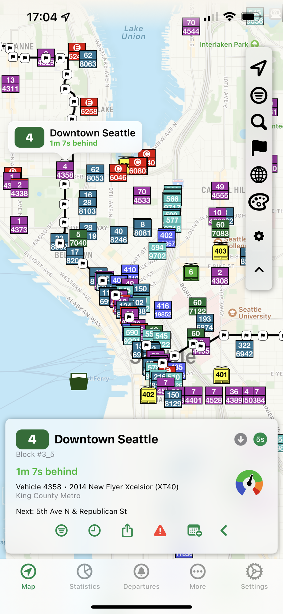 Pantograph gives you insights into your travels—and the whole transit system—like no app before it. Every active bus, train, ferry, and streetcar from supported agencies is visible on one map, empowering you with information only before seen by dispatchers. Plus, when you know your stop, see realtime departure estimates for every route arriving.