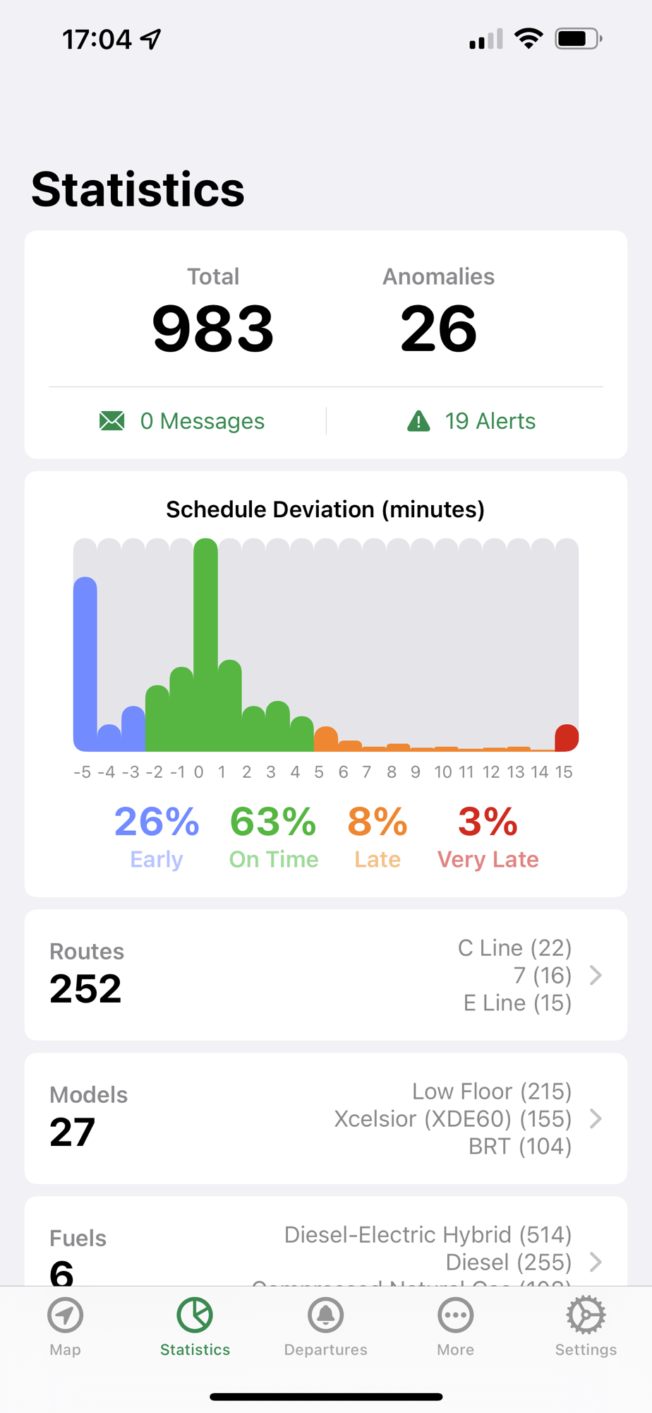 • View statistics for all vehicles on the map, including how many are on-time, running later than usual, currently serving each route, and more.