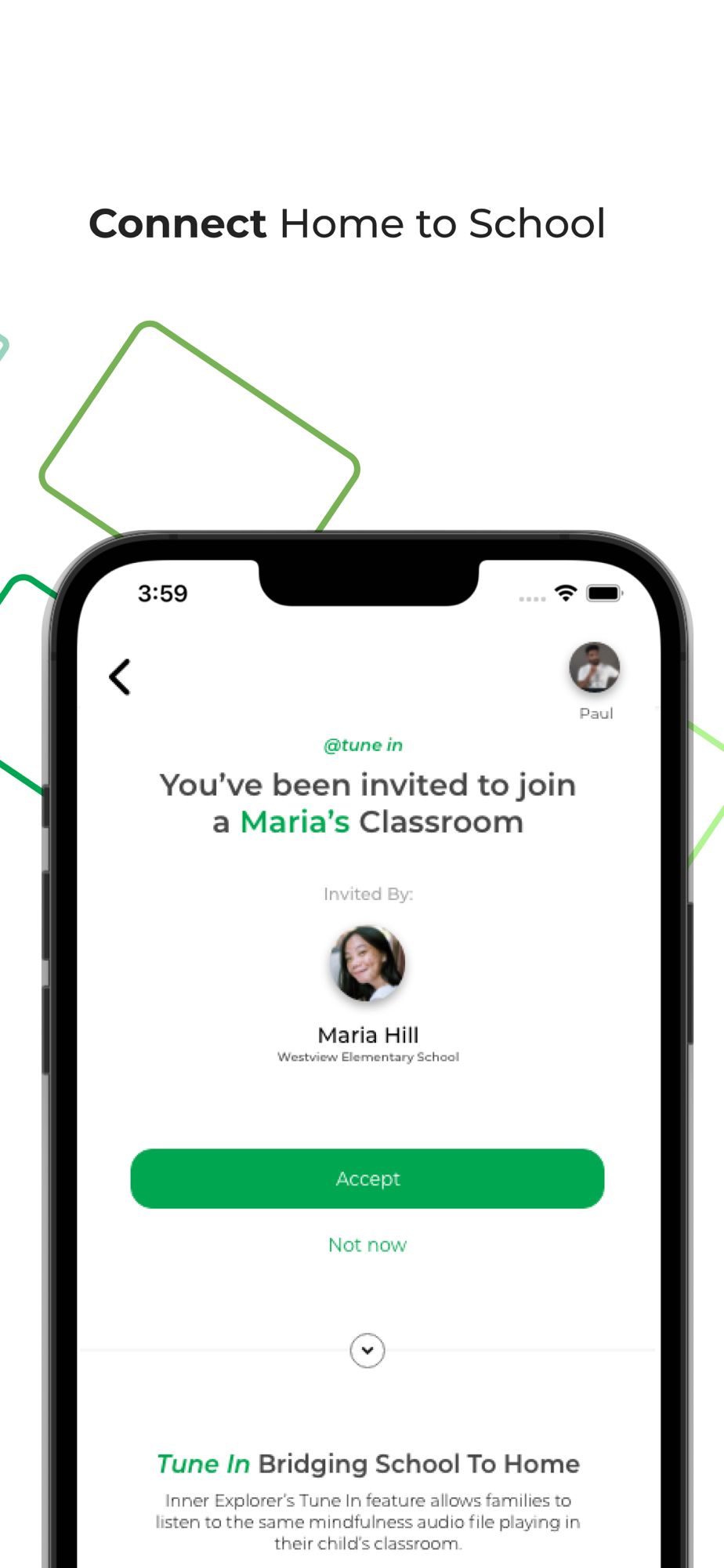 With Inner Explorer's Home App, you and your family can enjoy peaceful sleep, lower anxiety, improved emotional regulation, better focus, and increased empathy and compassion. Our exclusive "Tune In" feature allows parents to stay connected and informed on how mindfulness is practiced in their child's classroom, so you can support your child's practice at home.