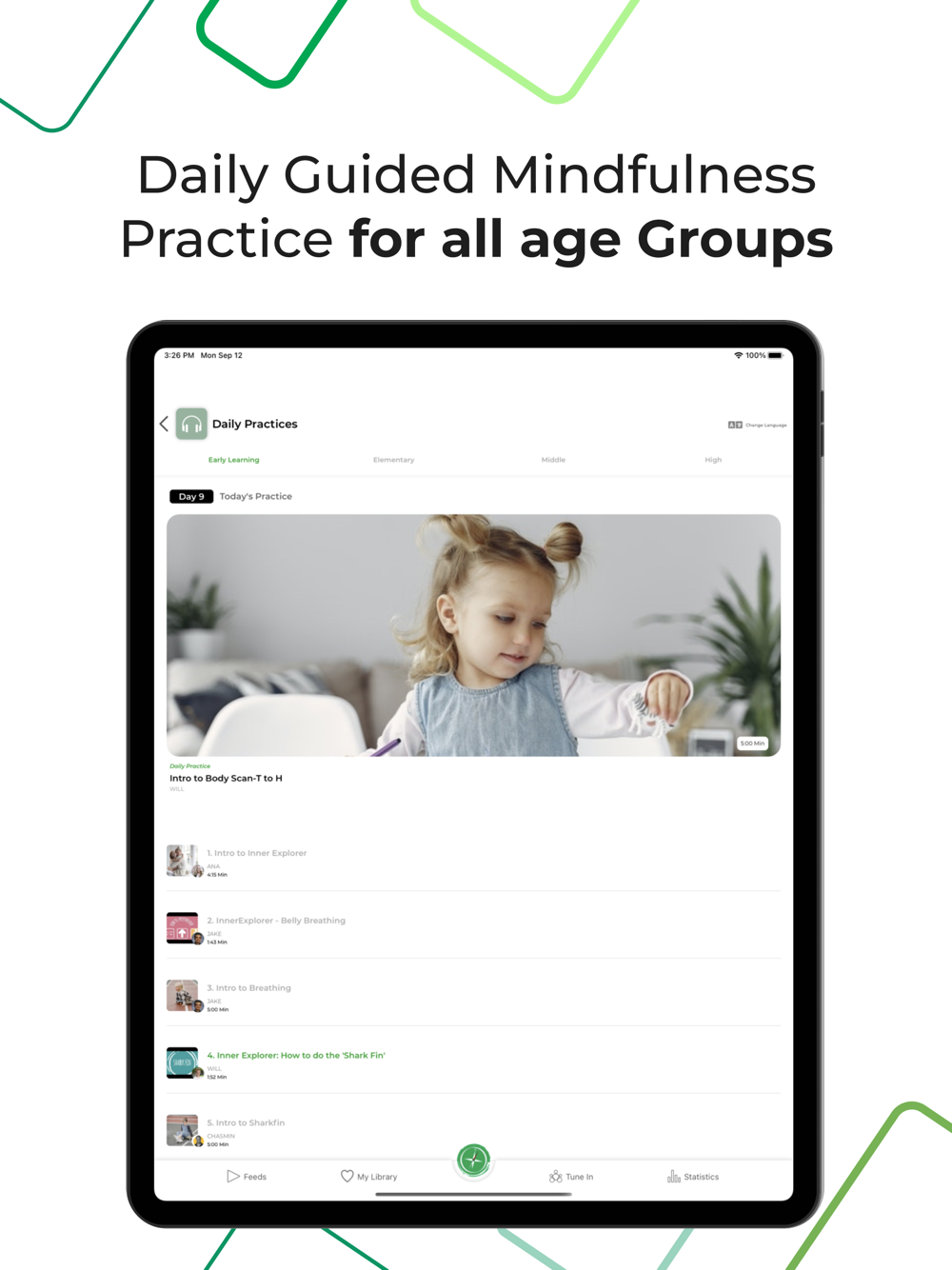 Our 180-day guided mindfulness program helps your child and your family thrive. Inner Explorer's Home App integrates with the Health app to save your mindfulness sessions and show them in a beautiful way. Plus, our program is available in English and Spanish for all age-appropriate programs.